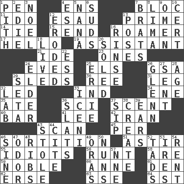 ACROSS 1. Fenced enclosure 4. Followers of ems 7. Alliance 11. Wedding promise 12. Son of Isaac 13. First class 14. Standoff 15. Tear apart 16. Wanderer 17. Phone greeting 19. Helper 21. Binary compound 23. Singles 24. Nights before holidays 25. Raised railways 26. Girls' org. (abbr.) 29. Bobsleighs 30. To sift 31. Part of a journey 32. Directed 33. Indiana (abbr.) 34. Compass dir. 35. Had dinner 36. _-fi 37. Odor 40. Tavern 41. Area sheltered from the wind 42. SW Asia republic 43. Skim 45. For each 46. Casting lots 51. Being in motion 55. Foolish or stupid persons 56. Undersized animal 58. "We ___ not amused" (Victoria) 59. Impressive in appearance 60. Queen of England 1702-14 61. Lair 62. Celtic language 63. Compass dir. 64. Fast jet (abbr.) DOWN 1. Essential or central part 2. Singer Brickell 3. Christmas carol 4. Compass dir. 5. Nanny 6. Soap bubbles 7. Naughty children 8. Pale green bean 9. Presage 10. Foregone conclusion 12. Worn away 13. Introduce or present, as a question 16. Remove soap 18. Moving, as bait 20. Having a sole or soles 22. Double-curved letter 24. A person who is older than you are 25. Bert's buddy 26. American astronaut and politician John 27. Transmitted 28. Mature 29. Stalk of a moss capsule 32. Experiment locale 33. Ancient Celtic tribe of eastern Britain 36. Narrow boards 37. Small drink 38. Make 39. Hearing organs 43. Fur scarf 44. Quote 46. Trig term 47. Scent 48. Teases 49. Mouths or openings 50. Religious women 52. Bits 53. Angers 54. Monthly bill 57. Compass dir.