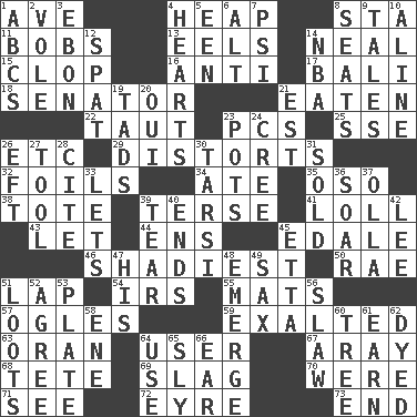 ACROSS 1. "___ Maria" 4. Pile 8. R.R. building 11. Moves up and down 13. Snakelike fish 14. Actress Patricia 15. Hoof sound 16. Opposed to 17. Indonesian resort city 18. Legislator 21. Consumed 22. Pulled tight 23. Personal Computers (abbr.) 25. Compass dir. 26. And so on (abbr.) 29. What propaganda does 32. Fencing necessities 34. Had dinner 35. Bear (Spanish) 38. Haul 39. Laconic 41. Hang loosely or laxly 43. Allow 44. Followers of ems 45. Peak District village in England 46. Most dubious of character or honesty 50. Actress Charlotte 51. Pet locale 54. Big collection agency 55. Floor protectors 57. Stares 59. Glorified 63. NW Algerian seaport 64. One who uses or employs something 67. Like ___ of sunshine 68. False hair 69. Volcanic refuse 70. Past tense of be (plural) 71. Perceive with the eye 72. Jane of fiction 73. Conclude DOWN 1. Lettered men learn these first 2. Short-tailed, large-bodied rat 3. Inky black, to poets 4. Centers 5. Car or cant ending 6. The first octave above the treble staff 7. 23rd letter of the Greek alphabet 8. Theater features 9. Stories 10. Place in a line 12. Petty quarrel 14. Basketball assoc. 19. Small boys 20. Fr. "Yes" 21. Eastern Standard Time (abbr.) 23. Plant holders 24. Algonquian 26. Bank Draft (abbr.) 27. Instrument 28. Quote 30. Tarsus (plural) 31. Exchanged or delivered for money 33. Allows 36. Fly high 37. Spanish pot 39. Rend 40. Conclusions 42. Area sheltered from the wind 45. Singer James 47. Part of HMS, perhaps 48. Develop 49. Saxophone 51. Plunders 52. Match 53. Food holder 56. Cole _ (cabbage dish) 58. Compass dir. 60. Family _ (genealogy) 61. Merit 62. Colored 64. Purpose 65. Roguish 66. Hearing organ