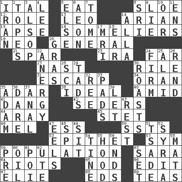 ACROSS 1. Slanted text style (abbr.) 5. Ingest 8. A type of plum 12. Hero or heavy, e.g. 13. Lion 14. Believer in; advocate of (suffix) 15. Domed church section 16. Wine waiters 19. Modern: prefix 20. Commissioned military rank 21. Practice fight 23. Retirement account (abbr.) 24. At a great distance 27. Political cartoonist Thomas 30. Cause heat under the collar 31. Fortification 34. Northwest Algerian city 35. The sixth month of the Jewish calendar 38. Perfect 40. Among 41. Mild oath, euphamism for damn 42. Spring feasts 44. Like ___ of sunshine 45. Proofreading order 46. Cartoonist voice _ Blanc 47. Curvy letter 50. Fast planes 53. Curse 57. Symbol (abbr.) 59. Census information 63. "Two Mules for Sister ____" 64. Disturbances 65. Dreamland 66. Prepare for publication 67. Writer Wiesel 68. Begley and Asner 69. Beverages made from leaves DOWN 1. SW Asia republic 2. Drinks excessively 3. Columnist Joseph or Stewart 4. Area sheltered from the wind 5. Otherwise 6. A really long time 7. Heavy book 8. _ Lanka 9. Falsehood 10. Rowing implement 11. Followers of ems 14. Silent film actress Nazimova 17. Medical imaging device (abbr.) 18. Ewer handle 20. Pate de foie ____ 22. Disorder of the immune system 24. Become taut 25. Jai _ 26. Tear apart 28. _-fi 29. Small amounts or degrees 30. Exposes to great heat 32. Portuguese money of account (variant) 33. Writing tablets 35. First of billions? 36. Have the gumption 37. Of or related to the anus 39. Allow 43. State of inaction 47. Snakelike fish 48. Health resort 49. Be seated 51. Sadhe (variant) 52. Damascus' land 54. Prong on a fork 55. Parka part 56. Extremities 58. Floor coverings 59. Before (prefix) 60. Lubricate 61. Luau course 62. Shoshoni 63. Arrange properly for use