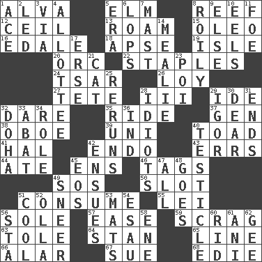 ACROSS 1. Inventor's middle name 5. Shade tree 8. Coral ridge 12. To provide with a ceiling 13. Wander 15. Margarine 16. Peak District village in England 18. Domed church section 19. Capri or Wight 20. The grampus (Milton) 22. Paper fasteners 24. Russian ruler of old 26. Myrna of the movies 27. False hair 28. One more than two 29. Binary compound 32. Have the gumption 35. Travel on or in a vehicle 37. Commissioned military rank (abbr.) 38. Mitch Miller's instrument 39. Single; one (prefix) 40. Frog relative 41. Actor Linden 42. Inside; within (prefix) 43. Blunders 44. Had dinner 45. Followers of ems 46. Labels 49. Distress signal 50. Position in a hierarchy or organization 51. Eat 55. Luau accessory 56. Not divided or shared with others 57. Comfort 59. Lean end of the neck 63. Lacquered or enameled metalware 64. Comedian Laurel of Laurel & Hardy 65. Actor's bit 66. Having or resembling wings 67. Institute legal proceedings 68. Singer Brickell DOWN 1. Adept person 2. Directed 3. By way of 4. One to whom something is allotted 5. Period 6. Chops off 7. Vertical spar for supporting sails 8. Turbulent 9. Otherwise 10. Snakelike fish 11. Enemy 14. Ear of corn 17. Celtic language 21. Feline 23. Luau course 25. Summer TV shows 28. Foolish or stupid persons 29. Composer Stravinsky 30. Letter starter 31. Extremities 32. Capital of the state of Qatar 33. Blind as ____ 34. Hero or heavy, e.g. 36. Indiana (abbr.) 40. One of the two male reproductive glands 42. Takes place subsequently 45. Greek goddess of the dawn 47. Everything 48. Moves 49. Contemptuous expression 51. Calm and collected 52. Spanish pot 53. Floor protectors 54. Son of Isaac 56. R.R. building 58. Compass dir. 60. To free from 61. Cuckoo 62. Turn to the right