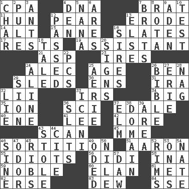 ACROSS 1. Accounting whiz (abbr.) 4. Heredity factor (abbr.) 7. Naughty child 11. Attila the _ 12. Lightbulb-shaped fruit 13. Eat (away) 14. The first octave above the treble staff 15. Singer Murray 16. Chalkboards 17. Musical pauses 19. Helper 21. Cleo's killer 23. Angers 24. Actor Baldwin 25. Mature 26. Benjamin's nick name 29. Bobsleighs 30. Followers of ems 31. Retirement account (abbr.) 32. Cards in a Roman deck? 33. Big collection agency 34. Of large size 35. Electrically charged atom 36. _-fi 37. Peak District village in England 40. Compass dir. 41. Area sheltered from the wind 42. Old wives' tales, e.g. 43. Skim 45. Madame (abbr.) 46. Determination 51. Composer Copland 55. Foolish or stupid persons 56. "You Light Up My Life" star Conn 58. _ tizzy (2 wds.) 59. Impressive in appearance 60. Enthusiasm 61. Was introduced to 62. Celtic language 63. Morning condensation 64. Compass dir. DOWN 1. Burn to charcoal 2. Whine 3. Pismires 4. Lair 5. Grandmother 6. Ancient Greek god of war 7. Naughty children 8. Roll call or roster of names 9. Arabian gulf 10. Trial 12. Went by 13. Otherwise 16. Founders of families 18. Story 20. Public displays of written messages 22. Personal Computers (abbr.) 24. Place in a line 25. Nest on high 26. The Good Book 27. 4th largest of the Great Lakes 28. Tired old horse 29. The Jewish people; Israel 32. Untruth 33. Ancient Celtic tribe of eastern Britain 36. Narrow boards 37. Shade tree 38. Kingdom 39. Length times width 43. Took without asking 44. Quote 46. Trig term 47. Scent 48. Chest bones 49. Wrote a lyric poem 50. The longest river in the world 52. Basketball hoops 53. Washington bills 54. Nathan's nickname 57. Simpleton