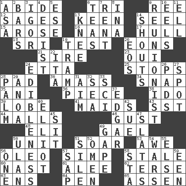 ACROSS 1. Tolerate 6. Three (prefix) 9. To separate or throw off 12. Gurus 13. Peachy ____! 14. Stitch closed the eyes of (a falcon) 15. Came up 16. Grandmother 17. Frame or body of a ship 18. _ Lanka 19. Trial 20. Immeasurably long periods of time 21. Male parent of an animal 23. Fr. "Yes" 24. Singer James 25. Discontinues 28. Writing tablet 30. Collect or gather 34. Fastener 35. Black tropical American cuckoo 36. Component 38. Wedding promise 39. Ear part 41. Unmarried girls 43. Fast jet (abbr.) 44. Shopping centers 46. Abrupt rush of wind 48. Connecticut Ivy Leaguer 49. Highlander 50. A single undivided whole 51. Fly high 53. Deep reverence 56. Butter sub 57. Simple or foolish person 58. Having lost freshness 60. Political cartoonist Thomas 61. Toward shelter 62. Laconic 63. Followers of ems 64. Animal enclosure 65. NE Netherlands city DOWN 1. White ___ sheet 2. Drinking establishments 3. Composer Stravinsky 4. Cease 5. Compass dir. 6. Afternoon social gatherings 7. Monthly bill 8. _ tizzy (2 wds.) 9. One who advocates reunion 10. Snakelike fish 11. Pipe bend 13. Leg joint 14. Yells 19. _____ steamer (cargo ship) 20. Greek goddess of the dawn 22. Call ___ day 24. The property of being fit to eat 26. Writing tablets 27. Blemish 28. Inside of hand 29. Small Philippine buffalo 31. Direct toward a target or goal 32. Ocean 33. _-fi 37. _ Allan Poe 40. American author Paul (1891-1958) 42. Institute legal proceedings 45. Be seated 47. Chalkboards 49. Yawn 50. ____ Bator 51. Drop; flow; fall 52. Sign of things to come 54. Armed conflicts 55. Otherwise 56. Single 57. Plant excrement 58. R.R. building 59. Car or cant ending