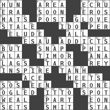 ACROSS 1. Attila the _ 4. Length times width 8. Shade of tan 12. Period 13. Within a short period 14. Greek god of love 15. Floor protectors 17. Mail 18. Michael Jackson trademark 19. Having lost freshness 21. Wedding promise 23. For each 24. Evade 26. 100% 28. Son of Isaac 30. Inveterate users 34. Yet 37. Fastener 39. Silvers or Donahue 40. Chicken ___ king 41. The easternmost of the Lesser Sundas 43. Santa ___, CA 44. Falls behind 46. Pacific island yam 47. Marina Del _, California 48. Heighten or intensify 51. Hyperbolic tangent 54. Adept person 55. Confronts 58. Mayday 61. Car or cant ending 63. Marketplace scale 65. Stared at amorously 67. "Tell ____ the Marines!" 71. Specific locale 72. Welt 73. Role in a play 74. A really long time 75. Puts into a specified state 76. Stricken, poetically 77. R.R. building DOWN 1. Cloth borders 2. A salt of uric acid 3. Relating to or accompanying birth 4. Cleo's killer 5. Friend of Pooh 6. Greek goddess of the dawn 7. Opposed to 8. Snakelike fish 9. Riding implement 10. Be footloose 11. One who makes use of a thing 16. Change direction abruptly 18. Precious metal 20. Begley and Asner 22. June honoree 25. Compass direction 27. Mouth edge 29. Join together 30. To the left, to Queeg 31. Burn to charcoal 32. Prong on a fork 33. Kill 34. Indonesian resort city 35. Uhlan (variant) 36. Labels 38. Housemaid (var.) 42. Wander aimlessly 45. Health resort 49. On the rocks 50. To separate or throw off 52. Remaining after all deductions 53. Possessive pronoun 56. Drinks excessively 57. Snob 58. Sty mamas 59. Double curve, resembling the letter S 60. Narrow board 62. Pinches, bites 64. Inactive volcano in Sicily 66. Raised railways 68. Scottish cap 69. Three (prefix) 70. Baseball player Mel