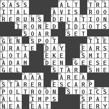 ACROSS 1. Backtalk 5. Keyboard modifier key 8. Three (prefix) 11. Slanted text style (abbr.) 12. Deliberation 13. Friend of Pooh 14. Summer TV shows 17. Conveyance 19. Pressed 21. Foolish or stupid persons 22. Fly high 23. Arrange properly for use 24. Commissioned mil. rank 27. Specific locale 29. Make a knot 32. A salt of uric acid 34. 24 hours 36. Hearing organs 37. Globular water bottle used in Asia 38. Supplement with great effort 39. Stricken, poetically 40. First of billions? 41. Lair 42. Honkers 43. Set 44. Play the lead 46. A female animal or person 47. Auto club (abbr.) 50. Type of rug 52. A viewer who gazes fixedly 55. Fortification 57. Coward 59. Unemotional ones 62. 100% 63. Naughty children 64. Petty quarrel 65. Teachers' org. 66. Consume 67. Suggestive of the supernatural DOWN 1. Title for a knight 2. Had dinner 3. Indian skirt 4. Runs notes together 5. "___ Maria" 6. Ms. Damita and namesakes 7. Sadhe (variant) 8. Musical group of three 9. Carrot, for example 10. Charged particles 12. Say or write further 15. Trap for birds or small mammals 16. Fastener 18. Teat (slang) 20. Worn away 24. Russian prison camp 25. Eat (away) 26. Relating to or accompanying birth 28. Receives possession of 29. Makes less strong or intense 30. From or relating to Ireland 31. First name in cosmetics 33. Scottish cap 35. Gossips 36. Compass dir. 42. Relatively large 45. Arches 47. Tate display 48. Nest on high 49. Scent 51. Came up 52. Connect, as a bridge 53. Lacquered or enameled metalware 54. Silent film actress Nazimova 55. Followers of ems 56. Corncob 58. Choose 60. Automobile 61. Filthy place