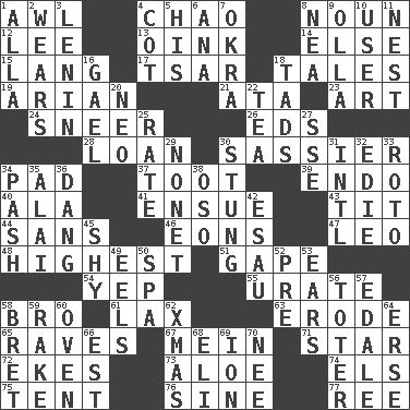 ACROSS 1. Leather borer 4. US Secretary of Labor Elaine L. _ 8. Part of speech 12. Area sheltered from the wind 13. Pig sound 14. Otherwise 15. Austrian-born American filmmaker Fritz 17. Russian ruler of old 18. Falsehoods 19. Believer in; advocate of (suffix) 21. "One Day ___ Time" 23. Tate display 24. Scornful expression 26. Begley and Asner 28. Grant temporary use of 30. More lively and spirited 34. Groovy apt. 37. A blast of a horn 39. Inside; within (prefix) 40. According to 41. Take place subsequently 43. Teat (slang) 44. Without 46. Immeasurably long periods of time 47. Lion 48. Having the greatest elevation 51. Stare wonderingly 54. Slangy assent 55. A salt of uric acid 58. Sis' sibling 61. Not strict 63. Eat (away) 65. All-night dance parties 67. Chow _ 71. Play the lead 72. Makes supply last 73. _ vera 74. Raised railways 75. Portable shelter 76. Trig term 77. To separate or throw off DOWN 1. Silent film actress Nazimova 2. Erodes 3. Soviet premier 1918-24 4. Small bed 5. Part of HMS, perhaps 6. Santa ___, CA 7. Gumbo ingredient 8. Teachers' org. 9. Spanish pot 10. One who uses or employs something 11. Egg locale 16. Highlander 18. Bits 20. Modern: prefix 22. Afternoon social gathering 25. Assign a rank or rating to 27. Compass dir. 29. Music written for nine 30. Feeling sharp psychological pain 31. International (abbr.) 32. Singer Brickell 33. Printing process, for short 34. Romantic infatuation 35. Jai ____ 36. Mild oath, euphamism for damn 38. Bear (Spanish) 42. Son of Isaac 45. Like a shrinking violet 49. Snakelike fish 50. Health resort 52. Before (prefix) 53. Hearing organs 56. Carrier 57. Peak District village in England 58. Cy Young winner Saberhagen 59. Immoral or dissolute person 60. Baking chamber 62. Dec. holiday 64. Celtic language 66. Eastern Standard Time (abbr.) 68. Biblical high priest 69. Electrically charged atom 70. Born