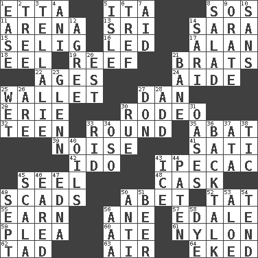 ACROSS 1. Singer James 5. Call ___ day 8. Distress signal 11. Sports stadium 13. _ Lanka 14. "Two Mules for Sister ____" 15. Major League Baseball Commissioner Bud 16. Directed 17. ____ Jay Lerner 18. Snakelike fish 19. Coral ridge 21. Naughty children 22. Eras 24. Helper 25. Place for singles 27. Daniel's nick name 29. 4th largest of the Great Lakes 30. Cowboy competition 32. Adolescent 33. Single shot of ammunition 35. Blind as ____ 39. Annoying sound 41. Suttee (variant) 42. Wedding promise 43. Medicinal drug used to evoke vomiting 45. Stitch closed the eyes of (a falcon) 48. Keg 49. Tons 50. Collude with 52. Make lace 55. Merit 56. One (Scot) 57. Peak District village in England 59. Entreaty 60. Had dinner 61. High-strength synthetic material 62. Small boy 63. Wind 64. Made supply last DOWN 1. Relaxation 2. Woody plant 3. Copy Pinocchio 4. Black tropical American cuckoo 5. Capri or Wight 6. Unclean, religiously 7. Assist 8. Vegetable dish 9. Declaim 10. Without 12. Match 14. Indian skirt 20. Eastern Standard Time (abbr.) 21. Object of repulsion 23. American astronaut and politician John 25. Soggy 26. "We ___ not amused" (Victoria) 27. Spanish title 28. Find the sum of 30. Regret 31. Fertile tracts in a desert 33. To free from 34. Bear (Spanish) 36. Sass 37. "One Day ___ Time" 38. Nervous spasm 40. Lubricates 43. Frozen water 44. Eucharist need 45. Any of the three canals of the cochlea 46. Having ears or earlike features 47. Pulitzer Prize-winning author Ferber 49. Back-to-school mo. 50. Against 51. Fermented drink made from hops 53. _ vera 54. Watch over 56. American Automobile Association (abbr.) 58. Color