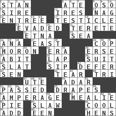 ACROSS 1. Comedian Laurel of Laurel & Hardy 5. Had dinner 8. Bear (Spanish) 11. The founder of a family 12. Angers 13. Tired old horse 14. Main course 17. A testis 19. Eluded 21. Cylindrical with tapered ends 22. Inactive volcano in Sicily 23. Ocean 24. Santa ___, CA 27. 90 degrees 29. Police officer (slang) 32. Person of subnormal intelligence 34. Epoch 36. Celtic language 37. "This won't hurt ____!" 38. Infant locale 39. Set or collection 40. Narrow board 41. Small drink 42. Postpone 43. Elected rep. 44. Pull apart 46. Three (prefix) 47. Shoshoni 50. The sixth month of the Jewish calendar 52. Went by 55. Window treatments 57. Electrical Measurement 59. Ear of corn 62. Sliced dessert 63. Cole _ (cabbage dish) 64. Calm and collected 65. Find the sum of 66. Car or cant ending 67. Coop moms DOWN 1. Compass dir. 2. Shallow baking pan 3. Johnson of "Laugh-In" 4. Boldness 5. "We ___ not amused" (Victoria) 6. Trials 7. First name in cosmetics 8. Single time 9. Table seasoning 10. Double curve, resembling the letter S 12. It would 15. Ingested 16. Pulitzer Prize-winning author Ferber 18. Lyricist Gershwin 20. Artist's stands 24. Collect or gather 25. Impressive in appearance 26. Believer in; advocate of (suffix) 28. Distinguishing feature 29. An unpleasant substance 30. Flexible twig of a willow tree 31. _ dish (used to culture cells) 33. Baseball player Mel 35. Become visible 36. Compass dir. 42. Window treatment 45. First of billions? 47. Purpose 48. Laconic 49. Peak District village in England 51. Arrive at 52. Dad 53. Among 54. Drove too fast 55. Morning condensation 56. _ gin 58. Separate the seeds from cotton 60. Electrically charged atom 61. Raised railways