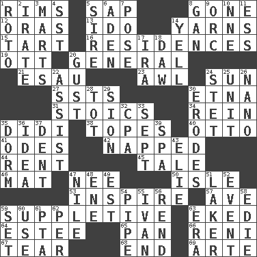 ACROSS 1. Basketball hoops 5. Plant excrement 8. Went 12. Mouths or openings 13. Wedding promise 14. Tall tales 15. Small pie 16. Dwellings 19. Baseball player Mel 20. Commissioned military rank 21. Son of Isaac 23. Leather borer 24. Player for Phoenix 27. Fast planes 30. Inactive volcano in Sicily 31. Unemotional ones 34. It's straight from the horse's mouth 35. "You Light Up My Life" star Conn 38. Drinks excessively 40. "Beetle Bailey" pooch 41. Lyric poems 42. Slept 44. Monthly bill 45. Lie 46. Floor protector 47. Born 50. Capri or Wight 53. Heighten or intensify 57. "___ Maria" 59. Supplying deficiencies 63. Made supply last 64. First name in cosmetics 65. Baking dish 66. Painter Guido (1575-1642) 67. Pull into pieces 68. Conclusion 69. Johnson of "Laugh-In" DOWN 1. Printing process, for short 2. Feeling or showing extreme anger 3. Shops 4. Fast jet (abbr.) 5. Father 6. An important port of Yemen 7. Introduce or present, as a question 8. Separate the seeds from cotton 9. The grampus (Milton) 10. Compass dir. 11. Double-curved letter 14. Shout 17. Lyricist Gershwin 18. Fool 20. Abrupt rush of wind 22. Help 24. Proofreading order 25. A single undivided whole 26. Billionth: prefix 28. Small child 29. The Jewish people; Israel 30. Eats (away) 32. Accounting whiz (abbr.) 33. Back-to-school mo. 35. Dormintory (informal) 36. It may be bright or harebrained 37. Undesirable depression on a surface 39. Health resort 43. Writer Wiesel 47. Mediterranean tributary 48. Compass dir. 49. Eastern Standard Time (abbr.) 51. Member of a famous L.A. basketball team 52. Happening 54. Corncob 55. _ the terrible 56. Tear apart 58. Singer Brickell 59. Put into a specified state 60. Purpose 61. Parent Teacher Association (abbr.) 62. For each 63. Epoch
