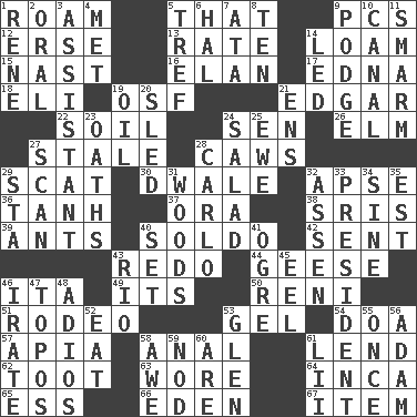 ACROSS 1. Wander 5. Not this but _ 9. Personal Computers (abbr.) 12. Celtic language 13. Pace 14. Rich soil 15. Political cartoonist Thomas 16. Style 17. Pulitzer Prize-winning author Ferber 18. Biblical high priest 19. Order of Saint Francis (abbr.) 21. _ Allan Poe 22. Earth 24. Elected rep. 26. Shade tree 27. Lacking originality or spontaneity 28. Crow sounds 29. Leave at once 30. A sleeping potion; an opiate (poet.) 32. Domed church section 36. Hyperbolic tangent 37. Mouth or opening 38. Indian titles of respect 39. Pismires 40. Twentieth part of a lira 42. Emitted 43. Do over again 44. Honkers 46. Call ___ day 49. It is 50. Painter Guido (1575-1642) 51. Cowboy competition 53. Set 54. ___ good deed 57. Capital of Western Samoa 58. Of or related to the anus 61. Grant temporary use of 62. A blast of a horn 63. Had on 64. South American Indian 65. Curvy letter 66. Locale of original sin 67. A distinct part DOWN 1. French philosopher Descartes 2. Of the mouth 3. Aide 4. Was introduced to 5. Unclean, religiously 6. Actor Linden 7. "One Day ___ Time" 8. Nine, plus one 9. Porridge 10. Lessep's creation 11. Excessive but superficial compliments 14. Directed 19. Lubricate 20. Downhill vehicle 21. Followers of ems 23. Curses 24. Vegetable dish 25. She-sheep 27. Examine hastily 28. Monte _, Las Vegas Hotel/Casino 29. R.R. building 31. Forest 32. NE Netherlands city 33. Elected leader of a country 34. Trig term 35. Eastern Standard Time (abbr.) 40. Arrange properly for use 41. Legendary monster 43. River (Sp.) 45. Snakelike fish 46. Feeling or showing extreme anger 47. Traditional theme or motif 48. Goodbye (Sp.) 52. Consume 53. Small, secluded valley 55. At one time in the past 56. First of billions? 58. Deep reverence 59. Allow head to fall sleepily 60. "We ___ not amused" (Victoria) 61. Cards in a Roman deck?