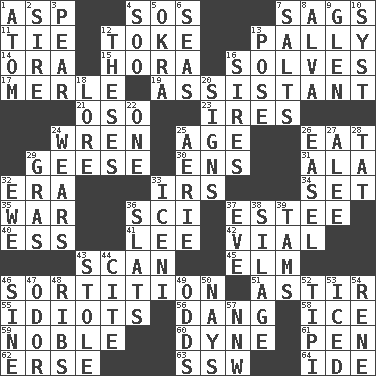 ACROSS 1. Cleo's killer 4. Distress signal 7. Settles 11. Make a knot 12. Casino tip 13. Friendly 14. Mouth or opening 15. Israeli folk dance 16. Finds the solution 17. Haggard of country music 19. Helper 21. Bear (Spanish) 23. Angers 24. Songbird 25. Personal question 26. Consume 29. Honkers 30. Followers of ems 31. In the manner of 32. Epoch 33. Big collection agency 34. Put into a specified state 35. Armed conflict 36. _-fi 37. First name in cosmetics 40. Curvy letter 41. Area sheltered from the wind 42. Small bottle 43. Examine hastily 45. Shade tree 46. Casting lots 51. Being in motion 55. Foolish or stupid persons 56. Mild oath, euphamism for damn 58. Frozen water 59. Impressive in appearance 60. Unit of force 61. Writing instrument 62. Celtic language 63. Compass dir. 64. Binary compound DOWN 1. Smallest unit of an element 2. Beget 3. Lightbulb-shaped fruit 4. "Barney Miller" actor Jack 5. Gumbo ingredient 6. Oceans 7. Table seasonings 8. Inventor's middle name 9. Small, secluded valley 10. System (abbr.) 12. College papers 13. Airs 16. Male parents of animals 18. Old wives' tales, e.g. 20. Signals 22. Single 24. Erodes 25. Nest on high 26. Artist's stand 27. Toward shelter 28. Make lace 29. Pate de foie ____ 32. She-sheep 33. Ancient Celtic tribe of eastern Britain 36. Narrow boards 37. Night before a holiday 38. Fodder prepared in a silo 39. Scottish caps 43. Took without asking 44. Quote 46. Trig term 47. Scent 48. Teases 49. Probability 50. Negative votes 52. Native american tent (variation) 53. On the rocks 54. French philosopher Descartes 57. Compass dir.
