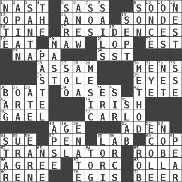 ACROSS 1. Political cartoonist Thomas 5. Backtalk 9. Within a short period 13. Brightly colored fish 14. Small Philippine buffalo 15. Message 16. Prong on a fork 17. Homes 19. Ingest 20. Informal term for the mouth 21. Chop off 22. Eastern Standard Time (abbr.) 23. California wine valley 25. Fast jet (abbr.) 26. Indian state 30. Not women's 34. Fur scarf 35. Sight organs 36. Water vessel 39. Fertile tracts in a desert 42. False hair 43. Johnson of "Laugh-In" 44. From or relating to Ireland 46. Highlander 47. Monte _, Las Vegas Hotel/Casino 48. Ripen 51. An important port of Yemen 54. Take to court 57. Fenced enclosure 58. Experiment locale 60. Police officer (slang) 62. Interpreter 65. Loose flowing garment 66. Match 67. Torque (variant) 68. Rounded earthenware pot or jar 69. French philosopher Descartes 70. Armor plate that protects the chest 71. Fermented drink made from hops DOWN 1. Brief written record 2. Bee-related 3. Before Barbara or Clara 4. Definite Article 5. "Two Mules for Sister ____" 6. Afresh 7. Distress signal 8. Travels by water 9. Male offspring 10. Single time 11. Lyric poems 12. Egg locale 15. Back-to-school mo. 18. Two (Sp.) 20. Vertical spar for supporting sails 24. Soft color 27. "Barney Miller" actor Jack 28. Chicken ___ king 29. Mesonic 30. Mode 31. Sight organ 32. Remaining after all deductions 33. Compass dir. 36. Container for groceries 37. Mouth or opening 38. Had dinner 40. Epoch 41. Title for a knight 45. Thick slice 48. Domed church section 49. Set 50. Maternal 52. Learning spot: Fr. 53. Having high moral qualities 54. Play the lead 55. Goad 56. Merit 58. Australian parrot (variant) 59. Curves 61. Lightbulb-shaped fruit 63. Born 64. Coat; cloak 65. Director Reiner
