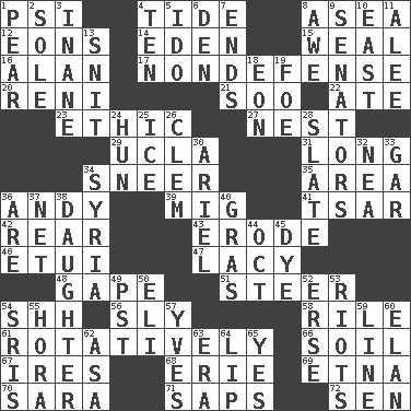 ACROSS 1. Air pressure measure (abbr.) 4. Event that recurs at intervals 8. Toward the sea 12. Immeasurably long periods of time 14. Genesis locale 15. Welt 16. Actor Alda or Thicke 17. Unrelated to defense, as in spending 20. Painter Guido (1575-1642) 21. "Barney Miller" actor Jack 22. Had dinner 23. Principle of right and wrong 27. Egg locale 29. Southern CA. univ. 31. Protracted 34. Contemptuous expression 35. Length times width 36. "60 Minutes" Commentator Rooney 39. Russian fighter aircraft 41. Russian ruler of old 42. Hitchcock's "____ Window" 43. Eat (away) 46. Needle holder 47. Made of lace 48. Yawn 51. Bull 54. Quiet! 56. Playfully artful 58. Cause heat under the collar 61. Producing rotation 66. The visible part of the earth's surface 67. Angers 68. One of the Great Lakes 69. Inactive volcano in Sicily 70. "Two Mules for Sister ____" 71. Plant excrements 72. Elected rep. DOWN 1. Lightbulb-shaped fruit 2. Not divided or shared with others 3. Silly 4. "___ Little Indians" 5. Wedding promise 6. Lair 7. Conclusions 8. Deep reverence 9. Legislators 10. 90 degrees 11. Toward shelter 13. In a ____ (agitated or irritated) 18. A really long time 19. Enemy 24. Attila the _ 25. Frozen water 26. Clement's nick name 28. Chalkboard 30. Satellite of Uranus 32. Teachers' org. 33. Slender fish 34. Damascus' land 36. "We ___ not amused" (Victoria) 37. Fish or hair follower 38. Female offspring 40. Pate de foie ____ 44. Sep. follower 45. Color 49. Pacific Standard Time (abbr.) 50. Connecticut Ivy Leaguer 52. Celtic language 53. Debaucheries 54. Indian titles of respect 55. Israeli folk dance 57. Jacques Cousteau's middle name 59. Actor's bit 60. Style 62. White ___ sheet 63. Epoch 64. Mouth edge 65. Consenting reply