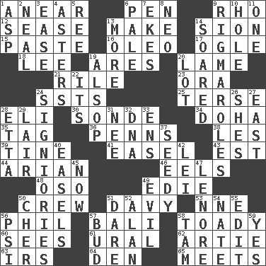 ACROSS 1. Approach 6. Writing instrument 9. 17th letter of the Greek alphabet 12. Gospel singer Marvin 13. Cause to be 14. The Jewish people; Israel 15. Thick mixture 16. Butter sub 17. Stare at amorously 18. Area sheltered from the wind 19. Ancient Greek god of war 20. Unable to walk 21. Cause heat under the collar 23. Mouth or opening 24. Fast planes 25. Laconic 28. Connecticut Ivy Leaguer 30. Message 34. Capital of the state of Qatar 35. Label 36. Actor Sean's family 38. French article 39. Prong on a fork 41. Artist's stand 43. Eastern Standard Time (abbr.) 44. Believer in; advocate of (suffix) 46. Snakelike fish 48. Bear (Spanish) 49. Singer Brickell 50. Group working together 51. American folk hero Crockett 53. Compass dir. 56. Silvers or Donahue 57. Indonesian resort city 58. Sycophant 60. Perceives with the eye 61. Mountain range 62. Nick name for Arthur 63. Big collection agency 64. Lair 65. Confronts DOWN 1. Viper 2. Anneal 3. Comfort 4. Michaelmas daisies 5. To separate or throw off 6. Light colored 7. Supplements with great effort 8. Modern: prefix 9. Complicated, petty procedures 10. Hollow 11. Single 13. Greater amount 14. Flew 19. Columnist Joseph or Stewart 20. Car dealer's back yard 22. It is 24. Seigniories (variant) 26. "______ My Girl" (Turtles hit) 27. 90 degrees 28. Singer James 29. Den 31. Born 32. Heredity factor (abbr.) 33. Followers of ems 37. Sleazy 40. Artist's stands 42. Flowery wreath 45. At this time 47. Poe poem 49. Tending to cause great harm 50. "Mermaids" star 51. Have the gumption 52. Actor Alda or Thicke 54. Nathan's nickname 55. Prepare for publication 56. Air pressure measure (abbr.) 57. Partially opened flower 58. Scottish cap 59. It is so