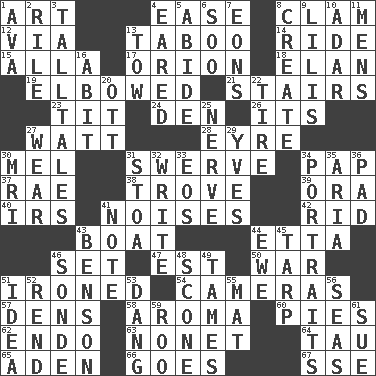 ACROSS 1. Nonscientific branch of learning 4. Relaxation 8. Dollar (slang) 12. By way of 13. Off limits 14. Travel on or in a vehicle 15. Silent film actress Nazimova 17. Constellation of myth 18. Liveliness 19. Shoved, as through a crowd 21. Flight of steps 23. Teat (slang) 24. Lair 26. It is 27. Electrical Unit 28. Jane of fiction 30. Cartoonist voice _ Blanc 31. Turn aside suddenly 34. Infant food 37. Actress Charlotte 38. Collection of objects 39. Mouth or opening 40. Big collection agency 41. Annoying sounds 42. To free from 43. Water vessel 44. Singer James 46. Put into a specified state 47. Eastern Standard Time (abbr.) 50. Armed conflict 51. Pressed 54. Devices for capturing images 57. Hiding places for outlaws 58. Odor 60. Sliced desserts 62. Inside; within (prefix) 63. Music written for nine 64. The 19th letter of the Greek alphabet 65. An important port of Yemen 66. Travels 67. Compass dir. DOWN 1. Actress Gardner 2. Cause heat under the collar 3. Baron Munchausen's specialties 4. Having ears or earlike features 5. Remain 6. "Barney Miller" actor Jack 7. Immeasurably long periods of time 8. Cause to be 9. Ms. Damita and namesakes 10. The sixth month of the Jewish calendar 11. Not women's 13. Pull behind 16. "This won't hurt ____!" 20. Baseball player Mel 22. Hoop that covers a wheel 25. Impudent aggressiveness 27. Erode 29. Jacques Cousteau's middle name 30. Medical imaging device (abbr.) 31. Portico 32. Compose 33. Greek goddess of the dawn 34. Likenesses of persons 35. Operatic vocal solo 36. Writing tablet 41. Observe 43. Gillaume's butler role 44. She-sheep 45. Canvas cover 46. Something which is sent 48. Biscuitlike quick bread 49. Makes less strong or intense 51. The content of cognition 52. Tear apart 53. Mild oath, euphamism for damn 55. Floor protector 56. Oceans 59. Friend of Pooh 61. Take to court