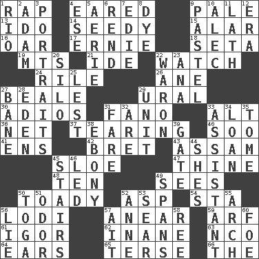 ACROSS 1. Hit sharply and swiftly 4. Having ears or earlike features 9. Diluted with white 13. Wedding promise 14. Morally degraded 15. Having or resembling wings 16. Rowing implement 17. Bert's buddy 18. Stalk of a moss capsule 19. Mountains (abbr.) 21. Binary compound 22. Timepiece 24. Cause heat under the collar 26. One (Scot) 27. Calif. Air Force Base 29. Mountain range 30. Goodbye (Sp.) 31. Papal veil 33. Keyboard modifier key 36. Remaining after all deductions 37. Rending 40. "Barney Miller" actor Jack 41. Followers of ems 42. Cy Young winner Saberhagen 43. Indian state 45. _ gin 47. One or ones belonging to thee 48. "___ Little Indians" 49. Observes 50. Sycophant 52. Viper 54. R.R. building 56. Farming town in central California 57. Approach 59. Sandy's bark 61. Russian composer Stravinsky 62. Silly 63. Non-commissioned officer (abbr.) 64. Hearing organs 65. Laconic 66. Definite Article DOWN 1. _ de Janeiro 2. First of billions? 3. Likenesses of persons 4. Compass dir. 5. Nest on high 6. Tear apart 7. Singer Brickell 8. Color 9. Soft color 10. Actor Baldwin 11. Thin strip of wood or metal 12. Period 20. Grain storage tower 22. Make _____ (do battle with) 23. Santa ___, CA 25. For fear that 27. Object of repulsion 28. Paradise 29. A single undivided whole 31. Conductor's collection 32. "We ___ not amused" (Victoria) 33. Aide 34. Grant temporary use of 35. Heavy book 38. Black 39. Yard entry 44. "______ My Girl" (Turtles hit) 45. Flight of steps 46. Directed 49. Connects, as a bridge 50. Ancient Roman robe 51. Aroma 52. Queen of England 1702-14 53. Wither 55. Bowlike part 56. Untruth 57. Small island 58. To riddle 60. Enemy