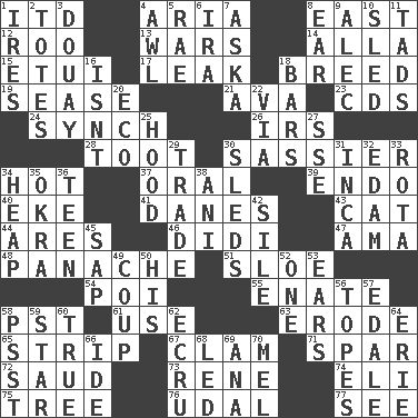 ACROSS 1. It would 4. Roberta Peters solo 8. Compass direction 12. Friend of Pooh 13. Armed conflicts 14. Silent film actress Nazimova 15. Needle case 17. Path through which fluid escapes 18. A special lineage 19. Gospel singer Marvin 21. Actress Gardner 23. Music discs 24. Synchronize (abbr.) 26. Big collection agency 28. A blast of a horn 30. More impudent 34. Being at a high temperature 37. Of the mouth 39. Inside; within (prefix) 40. Make supply last 41. Natives or inhabitants of Denmark 43. Feline 44. Ancient Greek god of war 46. "You Light Up My Life" star Conn 47. Housemaid (var.) 48. Flamboyance 51. A type of plum 54. Luau course 55. Maternal 58. Pacific Standard Time (abbr.) 61. Purpose 63. Eat (away) 65. Empty completely 67. Dollar (slang) 71. Coast Guard woman 72. Saudi Arabian king (1953-1964) 73. French philosopher Descartes 74. Biblical high priest 75. Woody plant 76. Hereditary estate 77. Observe DOWN 1. Angers 2. Hauls 3. A city in N France, SE of Calais 4. Leather borer 5. Actress Charlotte 6. Lyricist Gershwin 7. "____ silly question..." 8. Hearing organ 9. Actor Baldwin 10. Downhill vehicle 11. Bits 16. Is not 18. Soap units 20. Environmental prefix 22. By way of 25. Parka part 27. Compass dir. 29. Exchange 30. Bobsleighs 31. South American Indian 32. Dutch treat 33. Round or rotation of duties 34. Pile 35. Gumbo ingredient 36. Adolescent 38. Black tropical American cuckoo 42. Drop; flow; fall 45. Plant excrement 49. Overturn; upset 50. Part of HMS, perhaps 52. Single 53. Hearing organs 56. Drinks excessively 57. Peak District village in England 58. Inconspicuous attention getter 59. Play the lead 60. Loyal 62. Shade of tan 64. 4th largest of the Great Lakes 66. Binary compound 68. Directed 69. Santa ___, CA 70. Cartoonist voice _ Blanc