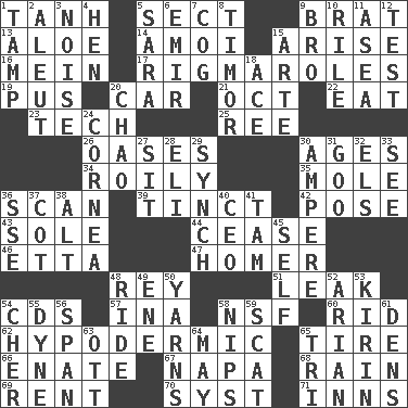 ACROSS 1. Hyperbolic tangent 5. Religious group 9. Naughty child 13. Medicinal plant 14. Mine, in Marseilles 15. Originate 16. Count _ (2 wds.) 17. Frustrating wastes of time 19. Product of festering 20. Auto 21. Sep. follower 22. Ingest 23. Georgia ____ (Atlanta school) 25. To sift 26. Fertile tracts in a desert 30. Ripens 34. Agitated, as a liquid 35. Undercover agent 36. Skim 39. Colored lightly or faintly 42. Airs 43. Flatfish 44. Desist 46. Singer James 47. Home run 48. Marina Del _, California 51. Path through which fluid escapes 54. Music discs 57. _ tizzy (2 wds.) 58. Science/research agcy. 60. To free from 62. Under the skin 65. Hoop that covers a wheel 66. Maternal 67. California wine valley 68. Precipitation 69. Monthly bill 70. System (abbr.) 71. Restaurants DOWN 1. Pack (down) 2. Native American of Southwest Alaska 3. Annoying sound 4. Layer 5. "Two Mules for Sister ____" 6. Arab leader 7. Gear tooth 8. The easternmost of the Lesser Sundas 9. Sis' sibling 10. Cause heat under the collar 11. At sea 12. Trial 15. Johnson of "Laugh-In" 18. Adept person 20. US Secretary of Labor Elaine L. _ 24. Pupil covering 27. Be seated 28. Connecticut Ivy Leaguer 29. Synchronize (abbr.) 30. Electrical Unit 31. Thick or sticky substance 32. Raised railways 33. Observe 36. Compass dir. 37. Small bed 38. The first octave above the treble staff 40. Corporate head (abbr.) 41. Scottish cap 45. Oneself 48. Travel on an animal 49. Compass dir. 50. Entertaining tales 52. Believer in; advocate of (suffix) 53. Japanese brewing company 54. "Mermaids" star 55. Unit of force 56. Connect, as a bridge 58. Pinches, bites 59. Scram! 61. Hiding places for outlaws 63. Baseball player Mel 64. Fifth month 65. Three (prefix)