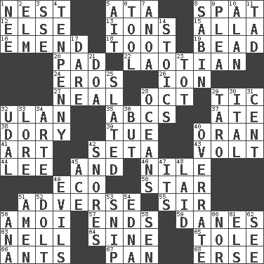 ACROSS 1. Egg locale 5. "One Day ___ Time" 8. Argument over a trivial matter 12. Otherwise 13. Charged particles 15. Silent film actress Nazimova 16. Make improvements or corrections to 18. A blast of a horn 19. Necklace unit 20. Groovy apt. 22. Of or relating to Laos or its people 24. Greek god of love 26. Electrically charged atom 27. Anneal 28. Sep. follower 29. Nervous spasm 32. Uhlan (variant) 35. Lettered men learn these first 37. Had dinner 38. Small, narrow, flatbottom fishing boat 39. Third day of the wk. 40. NW Algerian seaport 41. Nonscientific branch of learning 42. Bristle 43. Electrical Unit 44. Area sheltered from the wind 45. Plus 46. The longest river in the world 49. Environmental prefix 50. Play the lead 51. Contrary to your interests or welfare 55. Title for a knight 56. Mine, in Marseilles 57. Conclusions 59. Natives or inhabitants of Denmark 63. 1994 drama film starring Jodie Foster 64. Trig term 65. Lacquered or enameled metalware 66. Pismires 67. Baking dish 68. Celtic language DOWN 1. Born 2. Shade tree 3. Compass dir. 4. 3-inch nail 5. Small island 6. Utensil 7. Small Philippine buffalo 8. Unit of acoustic absorption 9. Entreaty 10. ____ Jay Lerner 11. Bit 14. Unemotional ones 17. Have the gumption 21. ___ good deed 23. Small child 25. Scheduled 28. Seas 29. Pacific island yam 30. Slanted text style (abbr.) 31. Penny 32. Allodial 33. Old wives' tales, e.g. 34. Johnson of "Laugh-In" 36. With the exception that 40. Make much ado about nothing 42. Sounds asleep 45. Adept person 47. It is 48. Put down 49. Vices 51. So be it 52. Dunce 53. Sever or remove by pinching or nipping 54. Pulitzer Prize-winning author Ferber 56. Santa ___, CA 58. Elected rep. 60. And not 61. Raised railways 62. Perceive with the eye