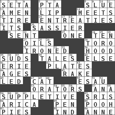 ACROSS 1. Stalk of a moss capsule 5. Parent Teacher Assoc. 8. Change direction abruptly 12. So be it 13. Mouth edge 14. Confronts 15. Hoop that covers a wheel 16. Pleas 19. It is 20. More disrespectful 21. Transmitted 23. Single 24. "___ Little Indians" 27. Petroleums 30. "Corrida" creature 31. Pressed 34. Parka part 35. Soap bubbles 38. Falsehoods 40. Otherwise 41. One of the Great Lakes 42. Food holders 44. Grows older 45. Immoral or dissolute person 46. Directed 47. Feline 50. Son of Isaac 53. Speakers 57. Santa ___, CA 59. Supplying deficiencies 63. Indian titles of respect 64. N. Chile seaport 65. Animal enclosure 66. "Silly old bear" 67. Sliced desserts 68. Indiana (abbr.) 69. Singer Murray DOWN 1. Suttee (variant) 2. Gives off 3. Laconic 4. A saturated hydrocarbon 5. Entreaty 6. Metal containers 7. Tenement units (abbr.) 8. Put into a specified state 9. Luau accessory 10. Shoshoni 11. Double-curved letter 14. Female horse 17. _ de Janeiro 18. Car or cant ending 20. Disorderly outburst 22. Annoying sounds 24. Utensil 25. Greek god of love 26. Connecting point 28. Car dealer's back yard 29. Fastener 30. College papers 32. Pipe bend 33. Letter starter 35. Lick closed 36. Goad 37. Passed on 39. R.R. building 43. Makes supply last 47. Root beer relative 48. "We ___ not amused" (Victoria) 49. Make lace 51. Composer Copland 52. The state of being joined or united 54. Native american tent (variation) 55. Baking chamber 56. Tear apart 58. American tennis player Robert 59. Plant excrement 60. RI univ. 61. Sliced dessert 62. Personal Computers (abbr.) 63. Health resort