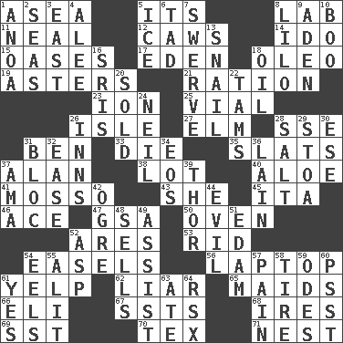 ACROSS 1. At sea 5. It is 8. Experiment locale 11. Be tempered by heat 12. Crow sounds 14. Wedding promise 15. Fertile tracts in a desert 17. Genesis locale 18. Butter sub 19. Michaelmas daisies 21. Food allowance for one day 23. Electrically charged atom 25. Small bottle 26. Small island 27. Shade tree 28. Compass dir. 31. Benjamin's nick name 33. Pass on 35. Narrow boards 37. ____ Jay Lerner 38. Car dealer's back yard 40. _ vera 41. With motion or animation 43. A female animal or person 45. Call ___ day 46. Adept person 47. Girls' org. (abbr.) 50. Baking chamber 52. Ancient Greek god of war 53. To free from 54. Artist's stands 56. Portable computer 61. Sharp bark 62. One who doesn't tell the truth 65. Women servants 66. Biblical high priest 67. Fast planes 68. Angers 69. Fast jet (abbr.) 70. John Ritter's dad 71. A home for chicks DOWN 1. Small Philippine buffalo 2. Oceans 3. 90 degrees 4. Toward shelter 5. Frozen water 6. Small amount or degree 7. Turn aside suddenly 8. _ and Stitch 9. Arabian gulf 10. Sometimes accompanies a hiss 13. Slow-paced one 16. Indian titles of respect 18. Petroleum 20. Disposed of to a purchaser 22. Scottish caps 24. Famous astronaut Armstrong 26. Lodging establishments 28. Table seasoning 29. Portico 30. Compass dir. 31. Group of countries in special alliance 32. Relaxation 34. Greek goddess of the dawn 36. (Had) reclined 37. Wet nurse (var.) 39. Son of Odin 42. Legendary monster 44. Morally bad or wrong 48. Makes a sale 49. Aid 51. Dutch treat 52. Cleo's killer 54. Snakelike fish 55. Came down and settled, as after flight 57. Ache 58. Become fatigued 59. Lyric poems 60. Inconspicuous attention getter 61. Affirmative reply 63. Had dinner 64. Acura sports coupe