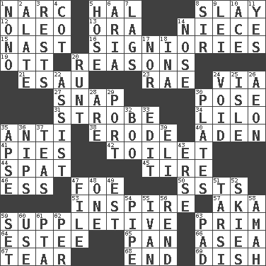 ACROSS 1. Drug cop 5. Actor Linden 8. Kill 12. Margarine 13. Mouth or opening 14. Sibling's daughter 15. Political cartoonist Thomas 16. Seigniories (variant) 19. Baseball player Mel 20. Thinks logically 21. Son of Isaac 23. Actress Charlotte 24. By way of 27. Fastener 30. Introduce or present, as a question 31. Disco prop 34. _ and Stitch 35. Opposed to 38. Eat (away) 40. Arabian gulf 41. Sliced desserts 42. Bathroom plumbing fixture 44. Argument over a trivial matter 45. Hoop that covers a wheel 46. Curvy letter 47. Enemy 50. Fast planes 53. Heighten or intensify 57. Alias (abbr.) 59. Supplementary 63. Demure 64. First name in cosmetics 65. Baking dish 66. Toward the sea 67. Rend 68. Conclusion 69. Food container DOWN 1. Words to Nanette 2. Having winglike extensions 3. Musical pauses 4. Small bed 5. Stockings 6. Roberta Peters solo 7. Fails to keep up a pace 8. Title for a knight 9. Luau accessory 10. Adept person 11. Affirmative reply 14. Sense of smell 17. Not either 18. _ tizzy (2 wds.) 20. Undersized animal 22. Aid 24. Nothingness 25. Capri or Wight 26. Period of immesurable duration 28. "We ___ not amused" (Victoria) 29. Left side of a ship or aircraft 30. Food holders 32. Sometimes accompanies a hiss 33. Prepare for publication 35. Domed church section 36. Cuts off 37. Beverages made from leaves 39. Connecticut Ivy Leaguer 43. Celtic language 47. Do some clerical work 48. Single 49. Eastern Standard Time (abbr.) 51. Tarsus (plural) 52. Atmospheres 54. Corncob 55. _ the terrible 56. Tear apart 58. Wet nurse 59. Put into a specified state 60. Purpose 61. Parent Teacher Assoc. 62. For each 63. Writing tablet