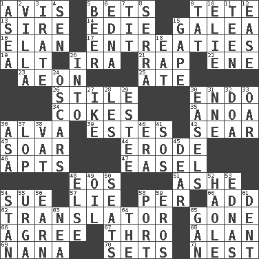 ACROSS 1. Advice 5. Antes 9. Wig 13. Male parent of an animal 14. Singer Brickell 15. An organ shaped like a helmet 16. Enthusiasm 17. Pleas 19. The first octave above the treble staff 20. Retirement account (abbr.) 21. Hit sharply and swiftly 22. Compass dir. 23. A really long time 25. Had dinner 26. Vertical member of a panel or frame 30. Inside; within (prefix) 34. Popular sodas 35. Small Philippine buffalo 36. Inventor's middle name 39. _____ Park, CO 42. Shrivel 43. Fly high 44. Eat (away) 46. Flats, for short 47. Artist's stand 48. Greek goddess of the dawn 51. American tennis player Robert 54. Take to court 57. Whopper 58. For each 60. Find the sum of 62. Interpreter 65. Went 66. Match 67. Through, poetically 68. Actor Alda or Thicke 69. Grandmother 70. Arranges properly for use 71. Egg locale DOWN 1. Toward the sea 2. Country residence 3. Feeling or showing extreme anger 4. Elected rep. 5. Fermented drink made from hops 6. Pulitzer Prize-winning author Ferber 7. Teat (slang) 8. Spanish missionary in California 9. Make lace 10. Writer Wiesel 11. Adolescent 12. Comfort 15. Yawn 18. Erode 20. To the inside or interior of 24. Motion picture awards 27. Mamie's mate 28. French article 29. First name in cosmetics 30. Artist's stands 31. Compass dir. 32. ___ good deed 33. Boat paddle 36. White ___ sheet 37. Chop off 38. Large container 40. Epoch 41. Mayday 45. Letter starter 48. Otherwise 49. Petroleum 50. Theater features 52. White Person, in Hawaii 53. Ferber et al. 54. Comedian Laurel of Laurel & Hardy 55. Capital and largest city of Mongolia 56. Merit 58. Left side of a ship or aircraft 59. Greek god of love 61. Undesirable depression on a surface 63. Teachers' org. 64. Definite Article 65. Separate the seeds from cotton
