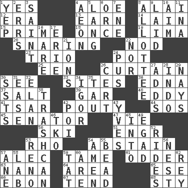 ACROSS 1. Consenting reply 4. Medicinal plant 8. Mountain range southwest of Kyrgyzstan 12. Epoch 13. Merit 14. (Had) reclined 15. A-one 18. At one time in the past 19. Pale green bean 20. Catching in a trap 22. Lower and raise head in agreement 23. Musical group of three 24. Plant holder 25. Car or cant ending 26. Window treatment 30. Perceive with the eye 33. Locates 36. Pulitzer Prize-winning author Ferber 37. Table seasoning 39. Slender fish 40. Whirlpool 41. Russian ruler of old 42. Inclined to pout 44. Distress signal 45. Elected representative 47. Compete 50. What Jean-Claude Killy likes to do 51. Engineer (abbr.) 53. 17th letter of the Greek alphabet 54. Refrain by choice 57. Actor Baldwin 59. Not wild 61. More peculiar 63. Nanny 64. Type of rug 65. Compass dir. 66. Inky black, to poets 67. Watch over 68. Filthy place DOWN 1. Slangy assent 2. Blunders 3. Inhabitant of Heaven 4. A really long time 5. Austrian-born American filmmaker Fritz 6. The grampus (Milton) 7. Compass dir. 8. One to whom something is allotted 9. Put down 10. Direct toward a target or goal 11. _ tizzy (2 wds.) 16. Female horse 17. 4th largest of the Great Lakes 21. Charged particles 22. And not 24. Fluid product of inflammation 26. Certainty 27. Does sums 28. _ china 29. Negative votes 30. Fast planes 31. Relaxation 32. Flair 34. Composer Stravinsky 35. The 19th letter of the Greek alphabet 38. File 13 42. Luau course 43. Jacques Cousteau's middle name 46. Ring climax 48. To the inside or interior of 49. Mild oath 52. Amusement-park features 53. Former U.S. Attorney General Janet 54. So be it 55. Necklace unit 56. A home for chicks 57. One (Scot) 58. Experiment locale 59. Make lace 60. "We ___ not amused" (Victoria) 62. Marina Del _, California