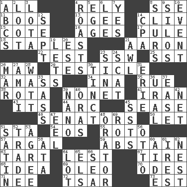 ACROSS 1. 100% 4. Have trust in 8. Compass dir. 11. Scornful sounds 13. Double curve, resembling the letter S 14. 154 in Roman numerals 15. ____ d'Azur (French Riviera) 16. Eons 17. Whimper 18. Paper fasteners 21. Composer Copland 22. Trial 23. Compass dir. 25. Fast jet (abbr.) 26. Informal term for the mouth 29. A testis 32. Collect or gather 34. _ tizzy (2 wds.) 35. Sorrow 38. Roll call or roster of names 39. Music written for nine 41. SW Asia republic 43. ___ a Wonderful Life 44. Curve 45. Gospel singer Marvin 46. Elected representatives 50. Allow 51. R.R. building 54. Greek goddess of the dawn 55. Printing process, for short 57. Therefore, facetiously 59. Refrain by choice 63. Small pie 64. For fear that 67. Hoop that covers a wheel 68. It may be bright or harebrained 69. Butter sub 70. Lyric poems 71. Born 72. Russian ruler of old 73. Eastern Standard Time (abbr.) DOWN 1. Lettered men learn these first 2. Spoils 3. Globular water bottle used in Asia 4. Ridicules or criticizes harshly 5. Oval reproductive body of a fowl 6. Area sheltered from the wind 7. Affirmative reply 8. Runs notes together 9. Grain storage towers 10. Happening 12. Back-to-school mo. 14. Tax preparer (abbr.) 19. Allows 20. Compass dir. 21. Leather borer 23. Trig term 24. Go away! 26. Spoil 27. Mine, in Marseilles 28. Electrical Unit 30. Colored lightly or faintly 31. 4th largest of the Great Lakes 33. Backtalk 36. Mountain range 37. Relaxation 39. Billionth: prefix 40. Mouths or openings 42. Remaining after all deductions 45. Fast planes 47. Snakelike fish 48. Speaker 49. Director Reiner 51. Smooth fabric 52. Swap 53. Match 56. Von Bismarck 58. _ moment's notice (2 wds.) 60. Assistant 61. Angers 62. A home for chicks 64. Car dealer's back yard 65. Raised railways 66. Ocean