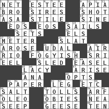 ACROSS 1. Remaining after all deductions 4. First name in cosmetics 9. Capital of Western Samoa 13. Sis' sibling 14. Founders of families 15. Attempt 16. White ___ sheet 17. Vertical member of a panel or frame 18. Trig term 19. Begley and Asner 21. Greek goddess of the dawn 22. Moves on water 24. Arranges properly for use 26. Raised railways 27. Distance measurement 29. Narrow board 30. Came up 31. Allodial 33. Wind 36. _ de Janeiro 37. Out of fashion; old fashioned 40. Indian title of respect (Mr.) 41. Snakelike fish 42. Downhill vehicle 43. Artist's stand 45. Made of lace 47. Originate 48. Santa ___, CA 49. Chooses 50. Some stationery 52. Part of a journey 54. And so on (abbr.) 56. Table seasoning 57. For Whom the Bell _____ 59. Sandy's bark 61. Margarine 62. Off-Broadway awards 63. Teachers' org. 64. Ooze 65. Honkers 66. "___ Little Indians" DOWN 1. Basketball assoc. 2. Celtic language 3. Inedible or poisonous agaric 4. Curvy letter 5. Settings 6. Musical group of three 7. Snakelike fish 8. Compass dir. 9. Aid 10. Silvers or Donahue 11. Charged atoms 12. Had dinner 20. Perceives with the eye 22. Exchanges for money 23. In the manner of 25. Not kosher 27. Female horse 28. One of the Great Lakes 29. Stated 31. Repulsive 32. Color 33. Helper 34. Angers 35. Cause heat under the collar 38. Witty Wilde 39. Pile 44. Johnson of "Laugh-In" 45. Portable computer 46. A saturated hydrocarbon 49. Stares 50. Light colored 51. Toward shelter 52. Ear part 53. Writer Wiesel 55. Algonquian 56. Distress signal 57. Coat; cloak 58. Compass dir. 60. Air blower
