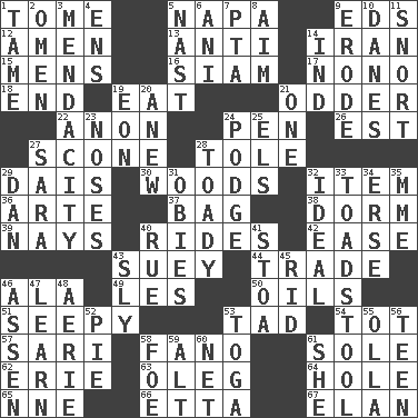 ACROSS 1. Heavy book 5. California wine valley 9. Begley and Asner 12. So be it 13. Opposed to 14. SW Asia republic 15. Not women's 16. Thailand, formerly 17. Words to Nanette 18. Conclude 19. Ingest 21. More peculiar 22. Soon (poet.) 24. Fenced enclosure 26. Eastern Standard Time (abbr.) 27. Biscuitlike quick bread 28. Lacquered or enameled metalware 29. Raised platform 30. Forest 32. A whole individual unit 36. Johnson of "Laugh-In" 37. Paper or plastic container 38. Dormintory (informal) 39. Negative votes 40. Amusement-park features 42. Comfort 43. Chop _ 44. Barter 46. Wing 49. French article 50. Petroleums 51. Not well drained, as in land 53. Small boy 54. Small child 57. Indian skirt 58. Papal veil 61. Flatfish 62. One of the Great Lakes 63. Cassini of fashion 64. Hollow 65. Compass dir. 66. Singer James 67. Flair DOWN 1. Not wild 2. Presage 3. Ananias' fault 4. Followers of ems 5. Political cartoonist Thomas 6. Black tropical American cuckoo 7. Parent Teacher Association (abbr.) 8. Direct toward a target or goal 9. Eat (away) 10. Natives or inhabitants of Denmark 11. Derisive sound 14. Working for oneself (abbr.) 19. A really long time 20. Afresh 21. Single 23. Olfactory organs 24. Puddle 25. Raised railways 27. "Two Mules for Sister ____" 28. Sycophant 29. One of the 12 tribes of Israel 31. Off-Broadway awards 32. Standard of perfection 33. Inedible or poisonous agaric 34. Celtic language 35. Madame (abbr.) 40. Regret 41. Portico 43. Stealthy 45. To free from 46. NE Netherlands city 47. Memorize 48. Nest on high 52. Sliced dessert 53. Ancient Roman robe 55. Water jar 56. Adolescent 58. Enemy 59. Keyboard modifier key 60. Remaining after all deductions 61. A female animal or person