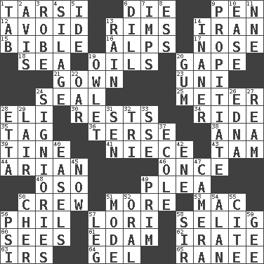 ACROSS 1. Tarsus (plural) 6. Pass on 9. Writing instrument 12. Keep away from 13. Basketball hoops 14. SW Asia republic 15. Instruction Manual for Humans 16. High mountains 17. Characteristic smell of wine 18. Ocean 19. Lubricates 20. Yawn 21. Bride's dress 23. Corn or form start 24. Lick closed 25. Distance measurement 28. Connecticut Ivy Leaguer 30. Musical pauses 34. Travel on or in a vehicle 35. Label 36. Laconic 38. Santa ___, CA 39. Prong on a fork 41. Sibling's daughter 43. Scottish cap 44. Believer in; advocate of (suffix) 46. At one time in the past 48. Bear (Spanish) 49. Entreaty 50. Group working together 51. Greater amount 53. Apple computer (short form) 56. Silvers or Donahue 57. Australian parrot (variant) 58. Major League Baseball Commissioner Bud 60. Perceives with the eye 61. Dutch treat 62. Feeling or showing extreme anger 63. Big collection agency 64. Set 65. Indian princess (variant) DOWN 1. Keyboard key 2. Opinion 3. Loose flowing garment 4. Fodder prepared in a silo 5. Binary compound 6. Deli pickle 7. Naughty children 8. Curvy letter 9. Appease 10. Comfort 11. Compass dir. 13. Water falling in drops from the sky 14. Sillier 19. A small or young owl 20. Chewing product 22. Boat paddle 24. Seigniories (variant) 26. Pulitzer Prize-winning author Ferber 27. 480, 500 or 516 sheets of paper 28. Singer James 29. Den 31. Elected rep. 32. Three (prefix) 33. Compass dir. 37. Learning spot: Fr. 40. Artist's stands 42. Compass dir. 45. At this time 47. Device for capturing images 49. Demure 50. "Mermaids" star 51. Method 52. Taken by mouth 54. Actor Alda or Thicke 55. Quote 56. 23rd letter of the Greek alphabet 57. Part of a journey 58. Title for a knight 59. Unit of force equal to gravity