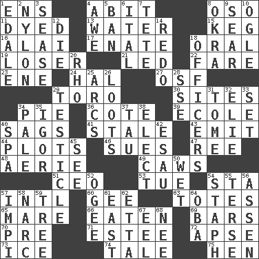 ACROSS 1. Followers of ems 4. "This won't hurt ____!" 8. Bear (Spanish) 11. Colored 13. Wetness 15. Barrel 16. Jai ____ 17. Maternal 18. Taken by mouth 19. Failure 21. Directed 22. Conductor's collection 23. Compass dir. 24. Actor Linden 27. Order of Saint Francis (abbr.) 29. "Corrida" creature 30. Locates 34. Sliced dessert 36. ____ d'Azur (French Riviera) 39. Learning spot: Fr. 40. Sinks 41. Showing deterioration from age 43. Send forth 44. Ground plans 46. Takes to court 47. Portuguese money of account (variant) 48. Nest on high 49. Crow sounds 51. Corporate head (abbr.) 53. Third day of the wk. 54. R.R. building 57. International (abbr.) 60. Unit of force equal to gravity 63. Hauls 65. Female horse 66. Consumed 69. Taverns 70. Before (prefix) 71. First name in cosmetics 72. Domed church section 73. Frozen water 74. Story 75. Layer DOWN 1. Peak District village in England 2. Thermoplastic polyamide 3. Gospel singer Marvin 4. Deep reverence 5. Forbid 6. Slanted text style (abbr.) 7. False hair 8. Gumbo ingredient 9. Singe 10. Stare at amorously 12. Pass on 14. Do over again 18. Persons of authority 20. 17th letter of the Greek alphabet 25. Curves 26. Plunders 28. Compass dir. 29. A testis 31. Heavy book 32. Writer Wiesel 33. Arrange properly for use 34. Light colored 35. Russian composer Stravinsky 37. The 19th letter of the Greek alphabet 38. Opt 40. Health resort 42. He sold his birthright 45. Observe 50. Soggy 52. Double curve, resembling the letter S 54. Staphylococcus 55. Laconic 56. NE Netherlands city 57. Body of Kaffir warriors 58. Drug cop 59. Relationship diagram 61. 90 degrees 62. Singer James 64. Chief or king in Benin or Nigeria 67. Snakelike fish 68. Born