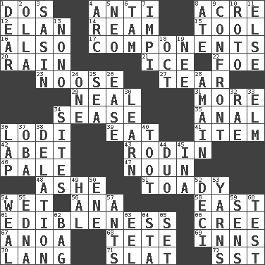 ACROSS 1. Two (Sp.) 4. Opposed to 8. 1/640 square mile 12. Style 14. 480, 500 or 516 sheets of paper 15. Implement 16. In addition 17. Pieces 20. Precipitation 21. Frozen water 22. Enemy 23. Trap for birds or small mammals 27. Rend 29. Actress Patricia 31. Greater amount 34. Gospel singer Marvin 35. Of or related to the anus 36. Farming town in central California 39. Erode 41. A whole individual unit 42. Collude with 43. "The Thinker" sculptor 46. Light colored 47. Part of speech 48. American tennis player Robert 51. Sycophant 54. Soggy 56. Santa ___, CA 58. 90 degrees 61. The property of being fit to eat 66. Algonquian 67. Small Philippine buffalo 68. Wig 69. Taverns 70. Long (Scottish) 71. Narrow board 72. Fast jet (abbr.) DOWN 1. Letter starter 2. Water jar 3. Indian antelope 4. Curve 5. Modern: prefix 6. Scottish cap 7. Body of Kaffir warriors 8. Had dinner 9. Meet 10. Printing process, for short 11. Otherwise 13. Words to Nanette 18. Sep. follower 19. Born 24. Single 25. Ocean 26. Relaxation 28. With great haste 30. Acquire or gain knowledge or skills 32. Actress Charlotte 33. Shade tree 34. Settings 36. Infant locale 37. Chief or king in Benin or Nigeria 38. Conveyance 40. A blast of a horn 44. Superhero pair 45. _ tizzy (2 wds.) 49. Actor Linden 50. Compass dir. 52. Tenth: prefix 53. Tall tales 54. Welt 55. Pulitzer Prize-winning author Ferber 57. Pismires 59. Elected reps. 60. Trial 62. Paper or plastic container 63. Snakelike fish 64. R.R. building 65. Put into a specified state