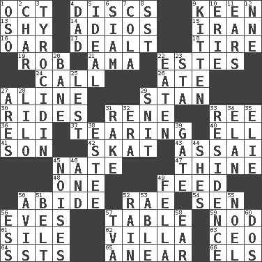 ACROSS 1. Sep. follower 4. Plates 9. Peachy ____! 13. Like a shrinking violet 14. Goodbye (Sp.) 15. SW Asia republic 16. Boat paddle 17. Started a card game 18. Hoop that covers a wheel 19. Director Reiner 21. Nursemaid (var.) 22. _____ Park, CO 24. Give a ring to 26. Had dinner 27. Place in a line 29. Comedian Laurel of Laurel & Hardy 30. Amusement-park features 31. French philosopher Descartes 33. To sift 36. Connecticut Ivy Leaguer 37. Rending 40. Pipe bend 41. Manchild 42. Three-handed card game 43. Slender Brazilian palm 45. Nathan's nickname 47. One or ones belonging to thee 48. Single 49. Nourish 50. Stay 52. Actress Charlotte 54. Elected rep. 56. Nights before holidays 57. Eating place 59. Lower and raise head in agreement 61. Drop; flow; fall 62. Country estate 63. Corporate head (abbr.) 64. Fast planes 65. Approach 66. Raised railways DOWN 1. Bear (Spanish) 2. Burn to charcoal 3. Polypeptide antibiotic 4. Male parent 5. Standard of perfection 6. Thailand, formerly 7. Root beer relative 8. Fast jet (abbr.) 9. Baby cat 10. One of the Great Lakes 11. Hearing organs 12. Compass dir. 20. Object of repulsion 22. Eroded 23. R.R. building 25. For fear that 27. Ancient Greek god of war 28. _ and Stitch 29. In a ____ (agitated or irritated) 31. Libertine 32. Period 33. Home 34. Flair 35. Writer Wiesel 38. First name in cosmetics 39. Yard entry 44. "______ My Girl" (Turtles hit) 45. Annoying sounds 46. Plus 49. Man or boy (slang) 50. Advice 51. Waist strap 52. Water falling in drops from the sky 53. Competent 55. Christmas carol 56. Curvy letter 57. Federal power corp. 58. Hearing organ 60. Two (Sp.)