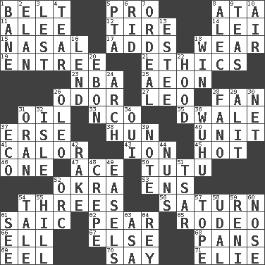 ACROSS 1. Waist strap 5. Adept person 8. "One Day ___ Time" 11. Toward shelter 12. Become fatigued 14. Luau accessory 15. Relating to the nose 17. Does sums 18. Erode 19. Main course 21. Value system 23. Basketball assoc. 25. Period of immesurable duration 26. Scent 27. Lion 28. Air blower 31. Lubricate 33. Non-commissioned officer (abbr.) 35. A sleeping potion; an opiate (poet.) 37. Celtic language 38. Attila the _ 40. A single undivided whole 41. Bodily heat indicating an inflammation 43. Electrically charged atom 45. Being at a high temperature 46. Single 47. Adept person 50. Ballerina skirt 52. Gumbo ingredient 53. Followers of ems 54. Triads 56. Titan orbits this 61. Ketch in the Levant 62. Lightbulb-shaped fruit 65. Cowboy competition 66. Pipe bend 67. Otherwise 68. Zero-star reviews 69. Snakelike fish 70. Declare 71. Writer Wiesel DOWN 1. Object of repulsion 2. Style 3. For fear that 4. Rend 5. Parent Teacher Assoc. 6. To free from 7. Severe or trying experience 8. Actor Baldwin 9. Afternoon social gatherings 10. Atmosphere 13. First name in cosmetics 16. Grant temporary use of 18. Acquire through effort 20. Inky black, to poets 22. Parka part 24. Bowlike part 26. Butter sub 28. Papal veil 29. Came down and settled, as after flight 30. Fish or hair follower 31. Northwest Algerian city 32. Small island 34. Fr. "Yes" 36. Chinese city south-southwest of Nanjing 37. Environmental prefix 39. Short letter 42. Immoral or dissolute person 44. Religious women 48. Streamer paper 49. Artist's stands 51. Russian ruler of old 52. The grampus (Milton) 54. Falsehood 55. Land elevation 57. Drink excessively 58. Hereditary estate 59. Painter Guido (1575-1642) 60. Characteristic smell of wine 61. Perceive with the eye 63. White ___ sheet 64. Marina Del _, California
