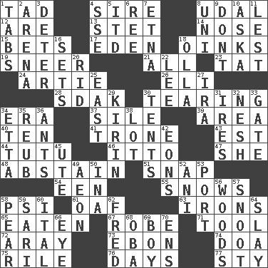 ACROSS 1. Bit 4. Male parent of an animal 8. Hereditary estate 12. "We ___ not amused" (Victoria) 13. Proofreading order 14. Sense of smell 15. Stakes 17. Genesis locale 18. Pig sounds 19. Contemptuous expression 21. 100% 23. Make lace 24. Nick name for Arthur 26. Biblical high priest 28. Neighbor of Neb. 30. Pulling into pieces 34. Epoch 37. Filth; sediment 39. Length times width 40. Nine, plus one 41. Heavy duty weighing machine 43. Eastern Standard Time (abbr.) 44. Ballerina skirt 46. "Tell ____ the Marines!" 47. A female animal or person 48. Choose not to consume 51. Fastener 54. Car or cant ending 55. Overwhelms 58. 23rd letter of the Greek alphabet 61. Clumsy lout 63. Removes the wrinkles 65. Eroded 67. Loose flowing garment 71. Instrument 72. Like ___ of sunshine 73. Inky black, to poets 74. ___ good deed 75. Cause heat under the collar 76. 24-hour periods 77. Filthy place DOWN 1. Bar bills 2. Sports stadium 3. Prevent from occurring 4. Compass dir. 5. It would 6. To sift 7. Inactive volcano in Sicily 8. Corn or form start 9. Do not 10. "____ silly question..." 11. For fear that 16. Puts into a specified state 18. Water jar 20. To free from 22. Area sheltered from the wind 25. 90 degrees 27. Retirement account (abbr.) 29. Japanese brewing company 30. Portable shelters 31. Angers 32. Tender 33. Yard entry 34. Singer James 35. Reuben's nickname 36. Pismires 38. Car dealer's back yard 42. Immeasurably long periods of time 45. Shoshoni 49. A really long time 50. _ tizzy (2 wds.) 52. Black tropical American cuckoo 53. Left side of a ship or aircraft 56. Forest 57. Snob 58. Lightbulb-shaped fruit 59. Indian skirt 60. Slanted text style (abbr.) 62. Flintstone 64. Kill 66. Sight organ 68. Chief or king in Benin or Nigeria 69. Male child 70. Followers of ems
