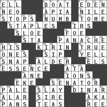 ACROSS 1. Pipe bend 4. Water vessel 8. Paradise 12. Modern: prefix 13. Capital of Western Samoa 14. Mediterranean tributary 15. Ceases 18. Unfeeling 19. Heavy book 20. Paper fasteners 22. Big collection agency 23. A type of plum 24. Enemy 25. R.R. building 26. Flamboyance 30. Part of HMS, perhaps 33. Japanese brewing company 36. Loyal 37. Singles 39. Small drink 40. Shout 41. Fastener 42. Tree or shrub in the Birch family 44. Raised railways 45. Gist 47. _ moment's notice (2 wds.) 50. One (Scot) 51. Charged particles 53. Make supply last 54. Legislator 57. Diluted with white 59. Kill 61. Middle Eastern gold or silver currency 63. Having or resembling wings 64. Father 65. Alias (abbr.) 66. Baking dishes 67. Afternoon social gatherings 68. To separate or throw off DOWN 1. Followers of ems 2. Allows 3. Plunders 4. Object of repulsion 5. Musical composition 6. Direct toward a target or goal 7. Bar bill 8. Plea 9. "Vaya con ____" 10. Shade tree 11. Born 16. Friends 17. Blemish 21. Path through which fluid escapes 22. Electrically charged atom 24. Air blower 26. Corncob 27. Algonquian 28. Frame or body of a ship 29. Snakelike fish 30. Flexible conduit 31. Restaurants 32. Oceans 34. Small island 35. To free from 38. Orators 42. Adept person 43. Water falling in drops from the sky 46. Compass dir. 48. Frog relative 49. Opposed to 52. Underwater navigation system 53. Liveliness 54. "Two Mules for Sister ____" 55. Snake ____ (dice throw) 56. Libertine 57. Infant food 58. Chicken ___ king 59. Fast jet (abbr.) 60. Whopper 62. Actress Charlotte