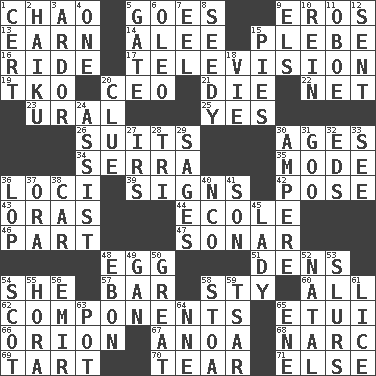 ACROSS 1. US Secretary of Labor Elaine L. _ 5. Moves 9. Greek god of love 13. Merit 14. Toward shelter 15. Military trainee 16. Travel on an animal 17. Boob tube 19. Ring climax 20. Corporate head (abbr.) 21. Expire 22. Fish or hair follower 23. Mountain range 25. Affirmative reply 26. Sets or collections 30. Eras 34. Spanish missionary in California 35. Method 36. Event scenes 39. Signals 42. Introduce or present, as a question 43. Mouths or openings 44. Learning spot: Fr. 46. Piece 47. Echolocation 48. Oval reproductive body of a fowl 51. Hiding places for outlaws 54. A female animal or person 57. Tavern 58. Filthy place 60. Everything 62. Parts 65. Needle case 66. Constellation of myth 67. Small Philippine buffalo 68. Drug cop 69. Small pie 70. Separate forcefully 71. Otherwise DOWN 1. Certainty 2. Japanese verse 3. Zeal 4. Single 5. Yard entry 6. Butter sub 7. Snakelike fish 8. Shabby and untidy 9. Raised railways 10. It's straight from the horse's mouth 11. Mitch Miller's instrument 12. Transmitted 15. Sliced desserts 18. Compete 20. A slight indication 24. Help 27. Big collection agency 28. Three (prefix) 29. Gurus 30. Electrical Unit 31. Thick or sticky substance 32. Begley and Asner 33. Perceive with the eye 36. Chop off 37. Mouth or opening 38. Auto 40. Non-commissioned officer (abbr.) 41. Male child 45. Kenny Rogers chart-topper in '80 48. Inky black, to poets 49. Separate the seeds from cotton 50. Relatively large 52. Brizilian seaport 53. Disparaging remarks 54. Highlander 55. Israeli folk dance 56. Independent ruler or chieftain 58. Portico 59. Russian ruler of old 61. Louse (plural) 63. Plant holder 64. Compass dir. 65. Compass dir.