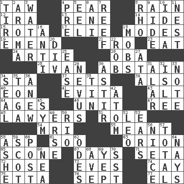 ACROSS 1. The 23rd letter of the Hebrew alphabet 4. Lightbulb-shaped fruit 8. Water falling in drops from the sky 12. Retirement account (abbr.) 13. French philosopher Descartes 14. Flintstone garb 15. Roll call or roster of names 17. Writer Wiesel 18. Methods 19. Make improvements or corrections to 21. Back 23. Consume 24. Nick name for Arthur 26. Chief or king in Benin or Nigeria 28. _ the terrible 30. Refrain by choice 34. R.R. building 37. Puts into a specified state 39. In addition 40. A really long time 41. Webber/Rice musical 43. The first octave above the treble staff 44. Grows older 46. A single undivided whole 47. To separate or throw off 48. Those who practice law 51. Hero or heavy, e.g. 54. Medical imaging device (abbr.) 55. Intended 58. Cleo's killer 61. "Barney Miller" actor Jack 63. Constellation of myth 65. Biscuitlike quick bread 67. 24-hour periods 71. Stalk of a moss capsule 72. Flexible conduit 73. Nights before holidays 74. Island 75. Singer James 76. Back-to-school mo. 77. Raised railways DOWN 1. Become fatigued 2. Scent 3. Wetness 4. Before (prefix) 5. Snakelike fish 6. Cuckoo 7. Coral ridge 8. 17th letter of the Greek alphabet 9. Helper 10. It may be bright or harebrained 11. Egg locale 16. Against 18. Crowds into 20. HTML Container Element 22. Director Reiner 25. Relaxation 27. _ moment's notice (2 wds.) 29. Congenital growth or mark on the skin 30. Being in motion 31. Having or resembling wings 32. Capri or Wight 33. Make mention of 34. Lick closed 35. Ancient Roman robe 36. Afresh 38. Metal container 42. Smallest unit of an element 45. Symbol (abbr.) 49. Celtic language 50. _ de Janeiro 52. Lion 53. Hearing organs 56. Sibling's daughter 57. "_____ Recall" 58. American tennis player Robert 59. Native of Scotland 60. Mail 62. Lyric poems 64. Negative votes 66. Teachers' org. 68. "___ Maria" 69. Slangy assent 70. Fast jet (abbr.)
