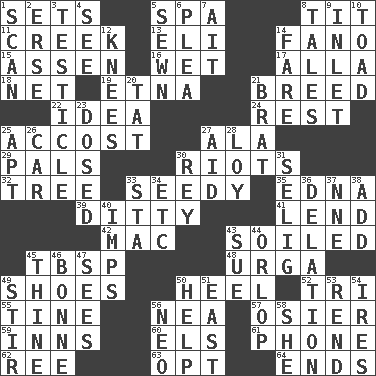 ACROSS 1. Puts into a specified state 5. Health resort 8. Teat (slang) 11. Small stream 13. Biblical high priest 14. Papal veil 15. NE Netherlands city 16. Soggy 17. Silent film actress Nazimova 18. Remaining after all deductions 19. Inactive volcano in Sicily 21. A special lineage 22. The content of cognition 24. State of inaction 25. Buttonhole 27. According to 29. Friends 30. Debaucheries 32. Woody plant 33. Morally degraded 35. Pulitzer Prize-winning author Ferber 39. Simple song 41. Grant temporary use of 42. Big _ 43. Dirtied 45. Cook's measure (abbr.) 48. Capital and largest city of Mongolia 49. Imelda's hoard 50. The bottom of a shoe or boot 52. Three (prefix) 55. Prong on a fork 56. Teachers' org. 57. Flexible twig of a willow tree 59. Lodging establishments 60. Raised railways 61. Give a jingle 62. Portuguese money of account (variant) 63. Elect 64. Conclusions DOWN 1. Glance over 2. Celtic language 3. A testis 4. Observe 5. Stitched 6. Entreaty 7. Small island 8. Stories 9. An arm off of a larger body of water 10. Frog relative 12. Leg joints 14. Conductor's collection 20. Make lace 21. Naughty child 23. Administered medicine 25. Fitting 26. Auto 27. Help 28. Myrna of the movies 30. Marina Del _, California 31. Major League Baseball Commissioner Bud 33. R.R. building 34. And so on (abbr.) 36. Conveyance 37. Compass dir. 38. Increase 40. Naughty children 43. Take to court 44. Lowest deck of a ship 45. One or ones belonging to thee 46. Child's nurse 47. Observes 49. Use a spoon 50. Assist 51. Compass direction 53. Tear apart 54. Angers 56. Modern: prefix 58. A female animal or person