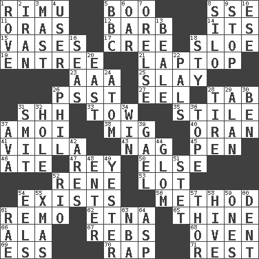 ACROSS 1. Tall New Zealand timber tree 5. Sometimes accompanies a hiss 8. Compass dir. 11. Mouths or openings 12. Sharp remark 14. ___ a Wonderful Life 15. Flower holders 17. Algonquian 18. _ gin 19. Main course 21. Portable computer 23. American Automobile Association (abbr.) 25. Kill 26. Inconspicuous attention getter 27. Snakelike fish 28. Bar bill 31. Quiet! 33. Pull behind 35. Vertical member of a panel or frame 37. Mine, in Marseilles 38. Russian fighter aircraft 40. Northwest Algerian city 41. Country residence 43. Tired old horse 45. Animal enclosure 46. Had dinner 47. Marina Del _, California 50. Otherwise 52. French philosopher Descartes 53. Car dealer's back yard 54. Is 56. Mode 61. San ____ (Riviera town) 62. Inactive volcano in Sicily 65. One or ones belonging to thee 66. According to 67. Confederate soldiers (slang) 68. Baking chamber 69. Curvy letter 70. Hit sharply and swiftly 71. Remainder DOWN 1. Be footloose 2. SW Asia republic 3. Vertical spar for supporting sails 4. One who uses or employs something 5. English channel? 6. Rowing implement 7. Threatening words 8. Grain storage tower 9. Obstruct or block passage 10. Compass dir. 13. Memphis, Tenn. Street 16. Oceans 18. Filthy place 20. 90 degrees 22. Friends 24. Tiny particle 26. Silvers or Donahue 28. Hoop that covers a wheel 29. ____ Jay Lerner 30. Benjamin's nick name 31. Stricken, poetically 32. Opening into or through something 34. Acquire through effort 36. Drink excessively 37. Actress Gardner 39. Highlander 42. Ancient Greek god of war 44. Seize upon or latch onto something 48. Keyboard key 49. Last past 51. Proofreading order 52. _ de Janeiro 54. Snakelike fish 55. Dec. holiday 57. Son of Odin 58. Hub of activity 59. Singles 60. Gouge 61. Actress Charlotte 63. Basketball assoc. 64. Viper