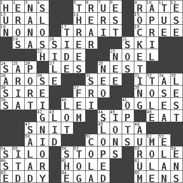 ACROSS 1. Coop moms 5. Loyal 9. Pace 13. Mountain range 14. Possessive pronoun 15. Musical composition 16. Words to Nanette 17. Distinguishing feature 18. Algonquian 19. More lively and spirited 21. What Jean-Claude Killy likes to do 22. Flintstone garb 23. Christmas carol 24. Plant excrement 27. French article 28. Egg locale 29. Came up 31. Observe 32. Slanted text style (abbr.) 36. Beget 37. Back 38. Characteristic smell of wine 39. Suttee (variant) 40. Flowery wreath 41. Stares 42. Take by theft 44. Small drink 46. Erode 47. In a ____ (agitated or irritated) 48. Globular water bottle used in Asia 50. Assist 51. Eat 54. Grain storage tower 56. Discontinues 58. Hero or heavy, e.g. 60. Play the lead 61. Hollow 62. ____ Bator 63. Whirlpool 64. Mild oath 65. Not women's DOWN 1. Attila the _ 2. Greek god of love 3. Nanny 4. Agitate, as a liquid 5. Triplets 6. Posterior 7. RI univ. 8. Eastern Standard Time (abbr.) 9. Shooting up abruptly 10. Showery time 11. Third day of the wk. 12. Compass dir. 17. Periodic rise and fall of the sea level 20. Filth; sediment 21. Mayday 23. Born 24. Backtalk 25. Operatic vocal solo 26. Left side of a ship or aircraft 28. Modern: prefix 30. Signiory (variant) 31. Indian title of respect (Mr.) 33. Lacquered or enameled metalware 34. Toward the sea 35. For fear that 37. Opposite of masc. 40. Car dealer's back yard 41. Elects 43. Hat (slang) 44. Had an oblique or slanted direction 45. Charged particles 47. Vegetable dish 49. Gold (Symbol: Au) 51. Root beer relative 52. Undercover agent 53. Flair 54. Compass dir. 55. It would 56. A female animal or person 57. Coat; cloak 59. Followers of ems