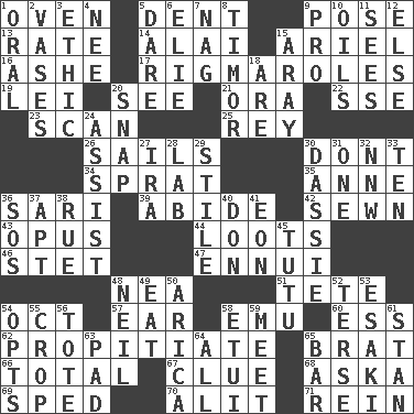 ACROSS 1. Baking chamber 5. Gouge 9. Airs 13. Assign a rank or rating to 14. Jai _ 15. Satellite of Uranus 16. American tennis player Robert 17. Frustrating wastes of time 19. Luau accessory 20. Perceive with the eye 21. Mouth or opening 22. Compass dir. 23. Examine hastily 25. Marina Del _, California 26. Travels by water 30. Do not 34. Small fatty European fish 35. Singer Murray 36. Indian skirt 39. Stay 42. Stitched 43. Musical composition 44. Plunders 46. Proofreading order 47. World-weariness 48. Teachers' org. 51. False hair 54. Sep. follower 57. Ewer handle 58. Australian flightless bird 60. Curvy letter 62. Appease 65. Naughty child 66. "_____ Recall" 67. A slight indication 68. "____ silly question..." 69. Broke a traffic law 70. Came down and settled, as after flight 71. It's straight from the horse's mouth DOWN 1. Taken by mouth 2. Flower holders 3. Value system 4. Born 5. Have the gumption 6. Writer Wiesel 7. Tired old horse 8. Southeast Indonesia island 9. Adept person 10. Petroleums 11. Perceives with the eye 12. Otherwise 15. Like ___ of sunshine 18. "We ___ not amused" (Victoria) 20. Fastener 24. Aid 27. Lyricist Gershwin 28. Experiment locale 29. Vertical member of a panel or frame 30. Small ungulate mammals of Africa 31. Single 32. Compass dir. 33. "___ Little Indians" 36. Mayday 37. Fitting 38. Sorrow 40. Spanish title 41. Period of immesurable duration 45. Ballerina skirt 48. Famous astronaut Armstrong 49. Erode 50. N. Chile seaport 52. Laconic 53. 1973 Nobel Price Winner (Physics) Leo 54. Elects 55. Riding implement 56. Carry 58. Needle case 59. Rendezvous 61. Comedian Laurel of Laurel & Hardy 63. Writing tablet 64. 100% 65. Oblong piece of solid material
