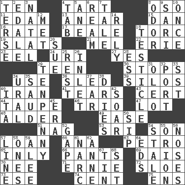 ACROSS 1. "___ Little Indians" 4. Small pie 8. Bear (Spanish) 11. Dutch treat 13. Approach 15. One of the 12 tribes of Israel 16. Pace 17. Calif. Air Force Base 18. Torque (variant) 19. Narrow boards 21. Cartoonist voice _ Blanc 22. 4th largest of the Great Lakes 23. Snakelike fish 24. RI univ. 27. Affirmative reply 29. Adolescent 30. Halts 34. Purpose 36. Downhill vehicle 39. Grain storage towers 40. SW Asia republic 41. Pulls into pieces 43. Sure thing 44. Grayish beige 46. Musical group of three 47. Car dealer's back yard 48. Tree or shrub in the Birch family 49. Relaxation 51. Tired old horse 53. Indian title of respect (Mr.) 54. Manchild 57. Grant temporary use of 60. Santa ___, CA 63. Stone: prefix 65. Inwardly 66. Leg coverings 69. Raised platform 70. Born 71. Bert's buddy 72. _ gin 73. Compass dir. 74. Penny 75. Followers of ems DOWN 1. Laconic 2. Peak District village in England 3. Relating to or accompanying birth 4. Keyboard key 5. One (Scot) 6. 480, 500 or 516 sheets of paper 7. Falsehood 8. Aroma 9. Indian skirt 10. At one time in the past 12. Was introduced to 14. Trust 18. One of the two male reproductive glands 20. Take to court 25. State of inaction 26. An arm off of a larger body of water 28. Curvy letter 29. 3-inch nail 31. Margarine 32. Left side of a ship or aircraft 33. Fast jet (abbr.) 34. Mountain range 35. Saudi Arabian king (1953-1964) 37. Hearing organ 38. Frees from moisture 40. Call ___ day 42. Fly high 45. Period 50. Small drink 52. Stare wonderingly 54. Showing deterioration from age 55. Constellation of myth 56. Olfactory organs 57. Actor's bit 58. Washington bills 59. Toward shelter 61. Drug cop 62. Queen of England 1702-14 64. Begley and Asner 67. Shallow baking pan 68. Put into a specified state