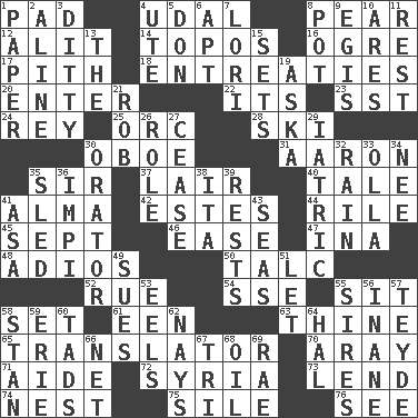 ACROSS 1. Groovy apt. 4. Freehold land 8. Lightbulb-shaped fruit 12. Came down and settled, as after flight 14. Literary convention 16. Legendary monster 17. Heart or essence 18. Pleas 20. Keyboard key 22. ___ a Wonderful Life 23. Fast jet (abbr.) 24. Marina Del _, California 25. The grampus (Milton) 28. What Jean-Claude Killy likes to do 30. Mitch Miller's instrument 31. Composer Copland 35. Title for a knight 37. Den 40. Lie 41. _ mater 42. _____ Park, CO 44. Cause heat under the collar 45. Back-to-school mo. 46. Comfort 47. _ tizzy (2 wds.) 48. Goodbye (Sp.) 50. Baby powder 52. Regret 54. Compass dir. 55. Be seated 58. Arrange properly for use 61. Car or cant ending 63. One or ones belonging to thee 65. Interpreter 70. Like ___ of sunshine 71. Assistant 72. Damascus' land 73. Grant temporary use of 74. A home for chicks 75. Drop; flow; fall 76. Perceive with the eye DOWN 1. Some stationery 2. Place in a line 3. Simple song 4. Shoshoni 5. Spanish title 6. Fitting 7. Australian parrot (variant) 8. Cooking vessel 9. The front part of a cuirass 10. Ancient Greek god of war 11. Relief 13. Definite Article 15. Arranges properly for use 19. "____ silly question..." 21. Director Reiner 26. Hero or heavy, e.g. 27. Stop 29. Of or pertaining to medicine 30. Speaker 32. Precipitation 33. Water jar 34. Born 35. Downhill vehicle 36. Body of Kaffir warriors 38. Call ___ day 39. Musical pauses 41. White ___ sheet 43. Oceans 49. Takes to court 51. Allow 53. Snakelike fish 55. Titles for men of rank and authority 56. Empty; void 57. Miss Universe 1986, Barbara Palacios _ 58. Comedian Laurel of Laurel & Hardy 59. One of the Great Lakes 60. Small amounts or degrees 62. Negative votes 64. Actor Linden 66. Fish or hair follower 67. Three (prefix) 68. Petroleum 69. Actress Charlotte