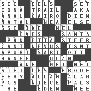 ACROSS 1. Observe 4. Snakelike fish 8. Put into a specified state 11. Pulitzer Prize-winning author Ferber 13. Get behind 15. Alias (abbr.) 16. Of or related to the anus 17. Capital of Egypt 18. South Vietnam president (1954) 19. Brizilian seaport 21. Teachers' org. 22. Otherwise 23. Compass dir. 24. Mamie's mate 27. Cartoonist voice _ Blanc 29. Nights before holidays 30. Before Barbara or Clara 34. Baking dish 36. Singer James 39. Bull 40. Patter 41. Mole, birthmark 43. Is not 44. To the left, to Queeg 46. Indian skirt 47. Baseball player Mel 48. The wife of a rajah (variant) 49. Uhlan (variant) 51. One (Scot) 53. Was introduced to 54. Remaining after all deductions 57. Proofreading order 60. French article 63. Eat (away) 65. Suggestive of the supernatural 66. Assad's deity 69. Having or resembling wings 70. Personal Computers (abbr.) 71. Sibling's daughter 72. Friends 73. Definite Article 74. Paradise 75. Born DOWN 1. Actors Connery and Penn 2. Ferber et al. 3. Maternal 4. And so on (abbr.) 5. Period 6. (Had) reclined 7. Father 8. Travel by water 9. Supplements with great effort 10. Docile 12. Insect wing 14. Rich soil 18. Conveyance 20. 54 in ancient Rome 25. Peachy ____! 26. _____ Park, CO 28. Curvy letter 29. Plea 31. A home for chicks 32. Portable shelter 33. Tate display 34. Dad 35. At once, immediately (arch.) 37. Federal power corp. 38. Gold (Symbol: Au) 40. Auto 42. Filth; sediment 45. "___ Little Indians" 50. Had dinner 52. Enthusiasm 54. Pitcher Ryan 55. Peak District village in England 56. Laconic 57. Back-to-school mo. 58. Technical work 59. Celtic language 61. Writer Wiesel 62. Downhill vehicle 64. Reproach for some lapse or misdeed 67. Adept person 68. Layer