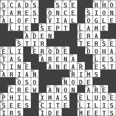 ACROSS 1. Tons 6. Compass dir. 9. 17th letter of the Greek alphabet 12. Makes less strong or intense 13. At one time in the past 14. The Jewish people; Israel 15. Upward 16. Small bottle 17. Stare 18. Whopper 19. Back-to-school mo. 20. Unable to walk 21. An important port of Yemen 23. Period 24. Tumult 25. Laconic 28. Biblical high priest 30. Eat (away) 34. Capital of the state of Qatar 35. Label 36. Sports stadium 38. French article 39. Prong on a fork 41. Approach 43. Eastern Standard Time (abbr.) 44. Believer in; advocate of (suffix) 46. Basketball hoops 48. Bear (Spanish) 49. Thickened enlargement 50. Ship's personnel 51. Soon (poet.) 53. "We ___ not amused" (Victoria) 56. Silvers or Donahue 57. Dec. holiday 58. Dodge 60. Observes 61. Quote 62. Ms. Damita and namesakes 63. Big collection agency 64. Binary compound 65. Confronts DOWN 1. R.R. building 2. Give a ring to 3. Mine, in Marseilles 4. Outscore 5. Fast jet (abbr.) 6. Sever or remove by pinching or nipping 7. Jazz singing style 8. Snakelike fish 9. Complicated, petty procedures 10. Hollow 11. Single 13. Baking chamber 14. Flew 19. Spanish missionary in California 20. Allow 22. Expire 24. Seigniories (variant) 26. "______ My Girl" (Turtles hit) 27. 90 degrees 28. Singer James 29. Den 31. Mouth or opening 32. Lair 33. Compass dir. 37. Composer Copland 40. Artist's stands 42. To free from 45. Immediately 47. Ear of corn 49. Characteristic smell of wine 50. "Mermaids" star 51. Among 52. Nathan's nickname 54. General guideline 55. Prepare for publication 56. Air pressure measure (abbr.) 57. One more than ninety 58. Shade tree 59. Double-curved letter