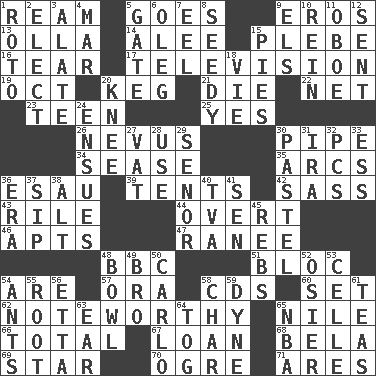 ACROSS 1. 480, 500 or 516 sheets of paper 5. Travels 9. Greek god of love 13. Spanish pot 14. Toward shelter 15. First-year military academy student 16. Lacerate 17. Boob tube 19. Sep. follower 20. Barrel 21. Expire 22. Fish or hair follower 23. Adolescent 25. Consenting reply 26. Mole, birthmark 30. Corncob 34. Gospel singer Marvin 35. Arches 36. He sold his birthright 39. Portable shelters 42. Backtalk 43. Cause heat under the collar 44. Unconcealed 46. Flats, for short 47. Indian princess (variant) 48. English channel? 51. Group of countries in special alliance 54. "We ___ not amused" (Victoria) 57. Mouth or opening 58. Music discs 60. Arrange properly for use 62. Music shop? 65. The longest river in the world 66. "_____ Recall" 67. Grant temporary use of 68. Actor Lugosi 69. Play the lead 70. Legendary monster 71. Ancient Greek god of war DOWN 1. Printing process, for short 2. Voters do this 3. Having winglike extensions 4. Spoil 5. Yard entry 6. Cassini of fashion 7. Snakelike fish 8. Morally degraded 9. Raised railways 10. It's straight from the horse's mouth 11. Mitch Miller's instrument 12. Transmitted 15. Sliced desserts 18. Compete 20. Leg joint 24. Follows as a consequence or result 27. Large container 28. Purpose 29. Sir (Sp.) 30. Soft color 31. Lyricist Gershwin 32. Personal Computers (abbr.) 33. Curvy letter 36. Epoch 37. Small drink 38. The first octave above the treble staff 40. Federal power corp. 41. Elected rep. 45. Confederate soldiers (slang) 48. Soup holder 49. Sis' sibling 50. Monte _, Las Vegas Hotel/Casino 52. Flexible twig of a willow tree 53. Cell (Danish) 54. Pismires 55. Carrot, for example 56. Singer James 58. Burn to charcoal 59. Centimeter-gram-second unit of force 61. Afternoon social gatherings 63. Hearing organ 64. Coat; cloak 65. Basketball assoc.