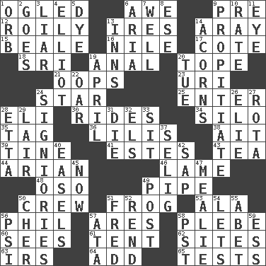 ACROSS 1. Stared 6. Deep reverence 9. Before (prefix) 12. Agitated, as a liquid 13. Angers 14. Like ___ of sunshine 15. Memphis, Tenn. Street 16. Mediterranean tributary 17. ____ d'Azur (French Riviera) 18. _ Lanka 19. Of or related to the anus 20. Drink excessively 21. I made a mistake 23. RI univ. 24. Play the lead 25. Keyboard key 28. Connecticut Ivy Leaguer 30. Amusement-park features 34. Grain storage tower 35. Label 36. Ms. Damita and namesakes 38. Small island 39. Prong on a fork 41. _____ Park, CO 43. Beverage made from leaves 44. Believer in; advocate of (suffix) 46. Unable to walk 48. Bear (Spanish) 49. Corncob 50. Ship's personnel 51. Toadlike animal 53. Chicken ___ king 56. Silvers or Donahue 57. Ancient Greek god of war 58. First-year military academy student 60. Perceives with the eye 61. Portable shelter 62. Settings 63. Big collection agency 64. Say or write further 65. Trials DOWN 1. Globe 2. Travels 3. One who doesn't tell the truth 4. American author Paul (1891-1958) 5. Color 6. Operatic vocal solo 7. Not ill 8. Compass dir. 9. Appease 10. Pace 11. Sight organ 13. Taverns 14. Oak nuts 19. Showery time 20. Third day of the wk. 22. Rowing implement 24. Seigniories (variant) 26. Writer Wiesel 27. Round or rotation of duties 28. Singer James 29. Den 31. Expire 32. Raised railways 33. Be seated 37. Major League Baseball Commissioner Bud 40. Artist's stands 42. Plant excrement 45. At this time 47. Ear of corn 49. Mail 50. "Mermaids" star 51. Flintstone 52. Tear apart 54. Allows 55. Collude with 56. Air pressure measure (abbr.) 57. "One Day ___ Time" 58. Pacific Standard Time (abbr.) 59. Curvy letter