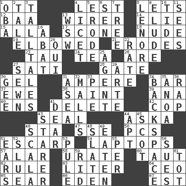 ACROSS 1. Baseball player Mel 4. For fear that 8. Allows 12. Sound made by sheep 13. One who wires 14. Writer Wiesel 15. Silent film actress Nazimova 17. Biscuitlike quick bread 18. Naked 19. Shoved, as through a crowd 21. Eats (away) 23. The 19th letter of the Greek alphabet 24. Beverage made from leaves 26. "We ___ not amused" (Victoria) 27. Suttee (variant) 28. Yard entry 30. Set 31. Electrical Unit 34. Soap unit 37. She-sheep 38. Inhabitant of Heaven 39. Santa ___, CA 40. Followers of ems 41. Erase 42. Police officer (slang) 43. Lick closed 44. "____ silly question..." 46. R.R. building 47. Compass dir. 50. Personal Computers (abbr.) 51. Fortification 54. Portable computers 57. Having or resembling wings 58. A salt of uric acid 60. Strained 62. General guideline 63. 61 cubic inches 64. Corporate head (abbr.) 65. Shrivel 66. Paradise 67. Eastern Standard Time (abbr.) DOWN 1. Chief or king in Benin or Nigeria 2. Falsehood 3. Baron Munchausen's specialties 4. It is permitted: Lat. 5. Eat (away) 6. Elected rep. 7. Family _ (genealogy) 8. Poe poem 9. Evade 10. Event that recurs at intervals 11. Observes 13. Compass dir. 16. Blind as ____ 20. Fr. "Yes" 22. Pace 25. Rep 27. Stitched 29. Johnson of "Laugh-In" 30. Turn to the right 31. At sea 32. Promenades 33. Sliced dessert 34. Keyboard key 35. Small Philippine buffalo 36. Hit sharply and swiftly 41. Letter starter 43. A viewer who gazes fixedly 44. Fitting 45. Native of Scotland 46. Any of the three canals of the cochlea 48. Schedule 49. Eroded 51. Hearing organs 52. Change direction abruptly 53. Whine 55. For each 56. Takes to court 59. To free from 61. Small child